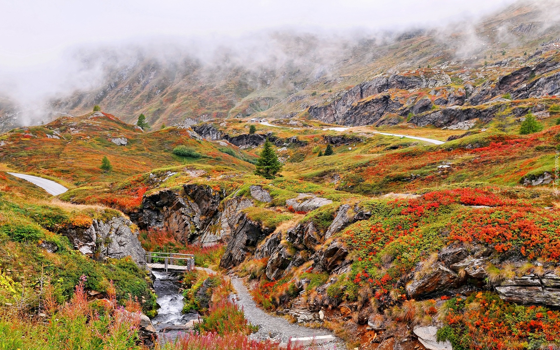 Edytor tapety: Jesień, Góry, Skały, Droga, Mgła