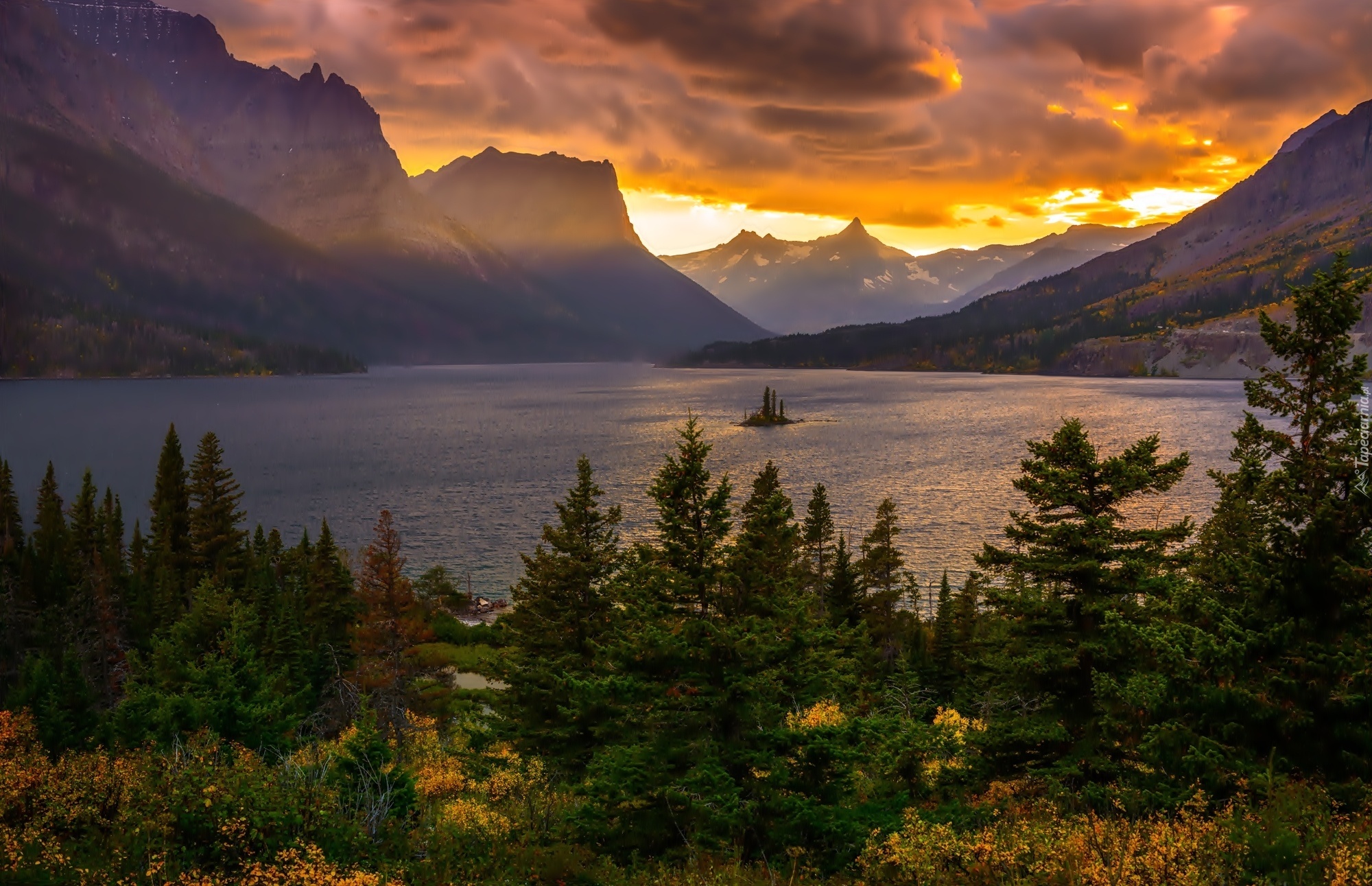 Edytor tapety: Chmury, Góry, Jezioro, Las, Wysepka