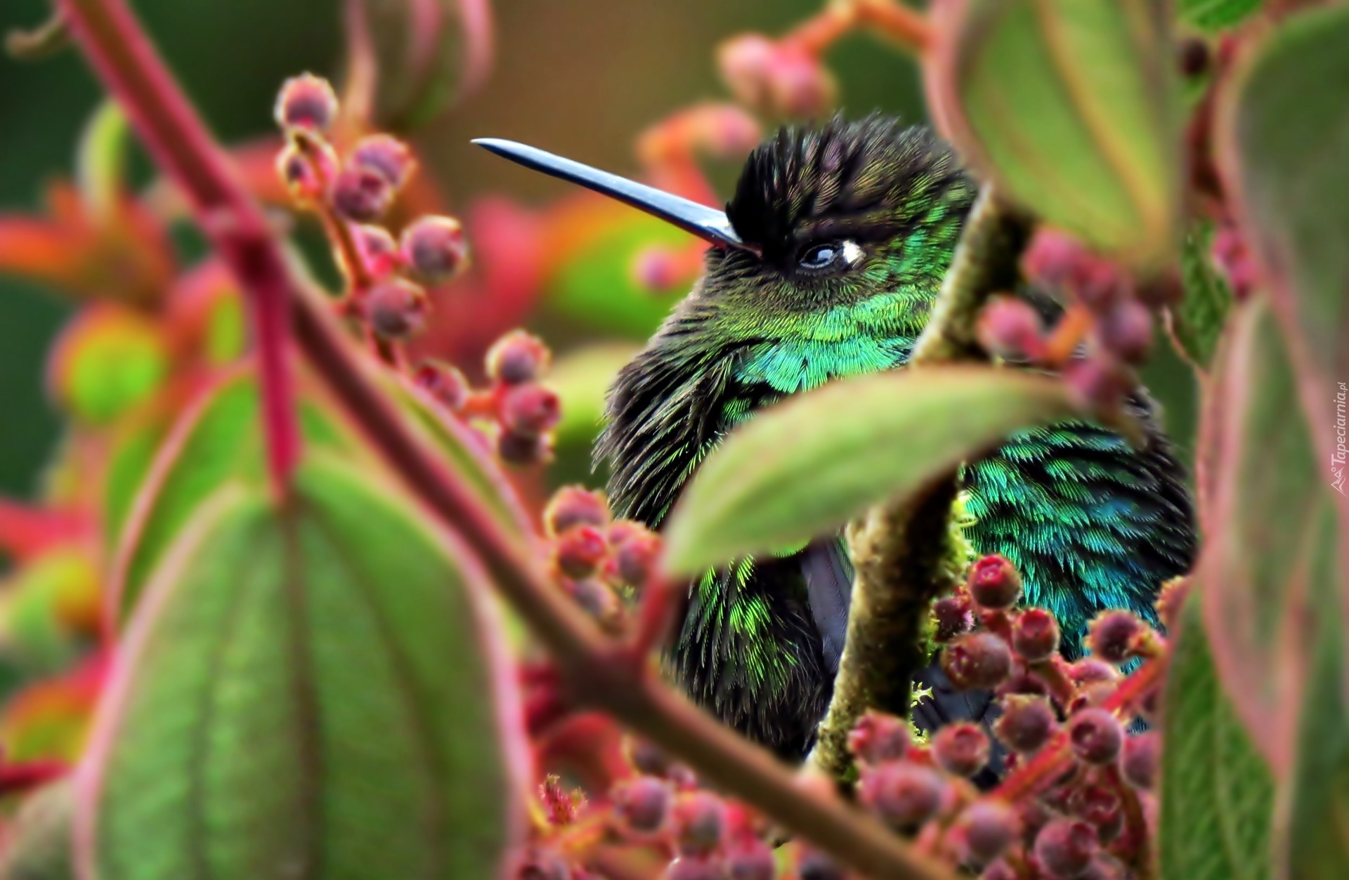 Edytor tapety: Ptak, Głowa, Koliber, Gałązki, Listki