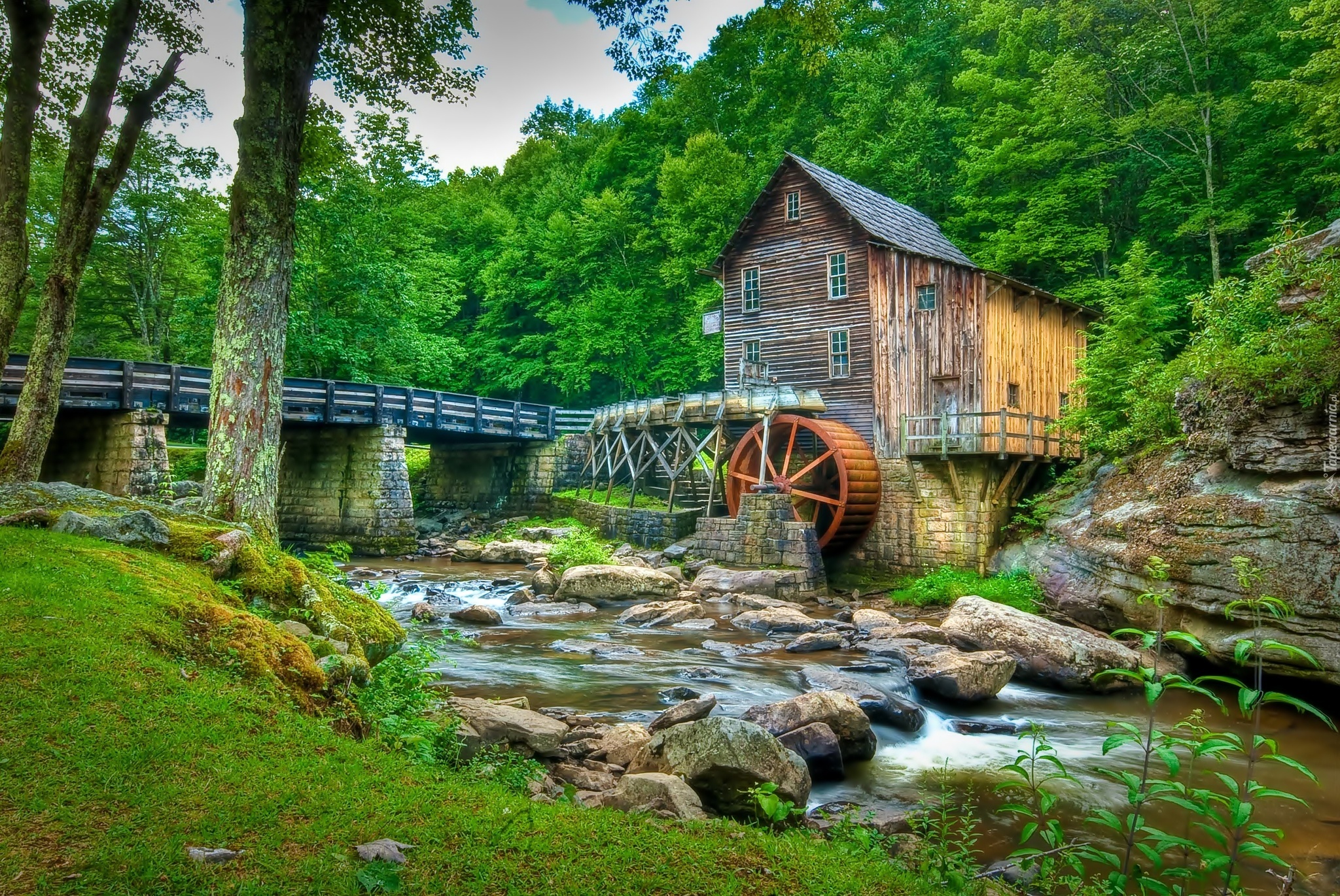 Edytor tapety: Młyn Wodny, Most, Las, Rzeka