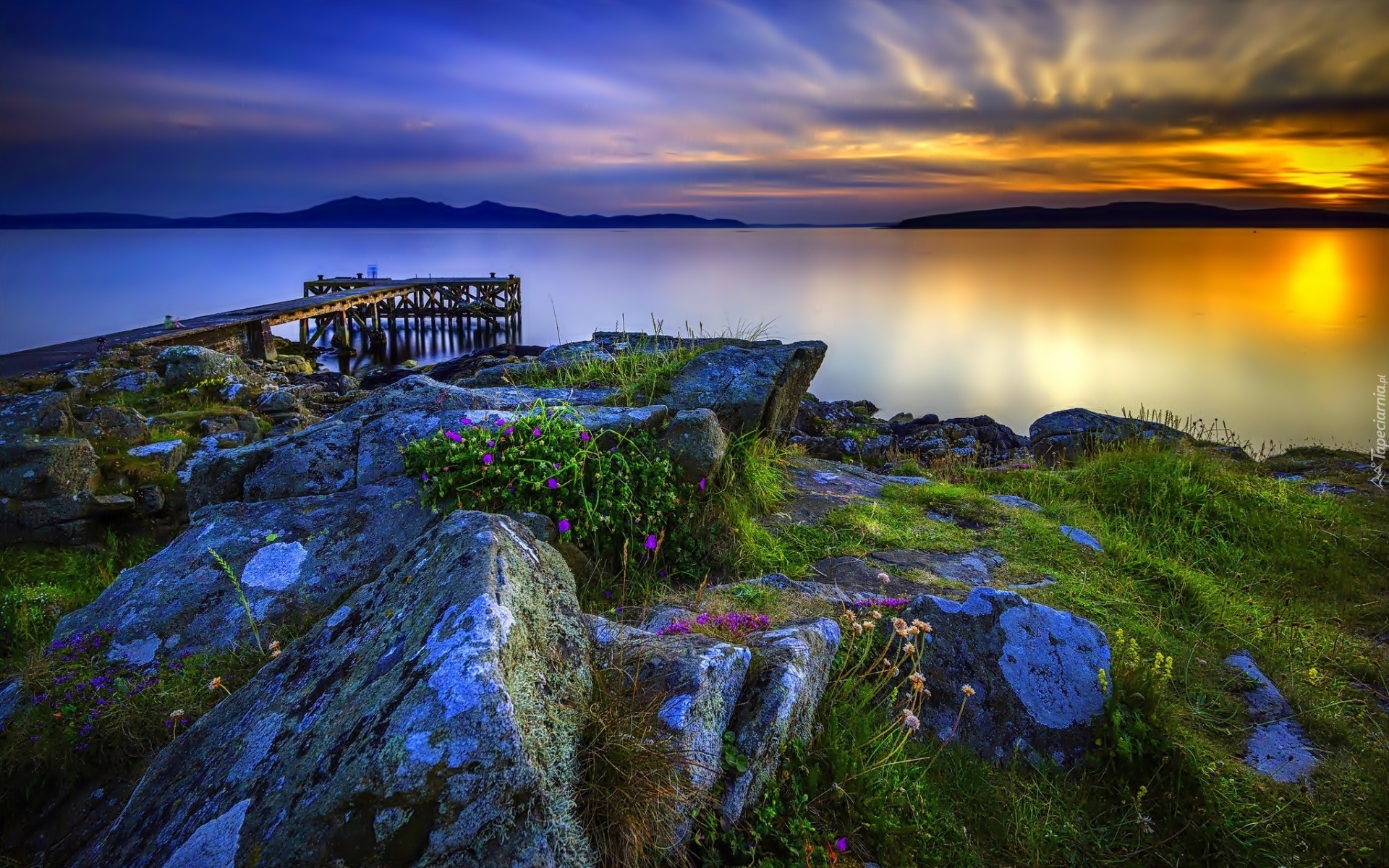 Edytor tapety: Morze, Skały, Pomost, Zachód, Słońca