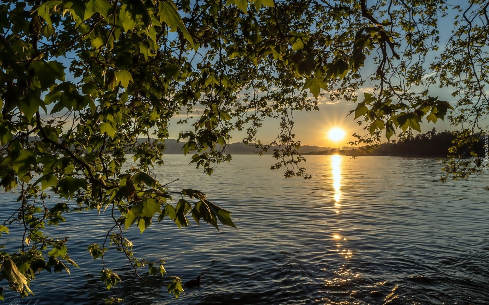 Edytor tapety: Jezioro, Góry, Drzewa, Promienie, Słońca
