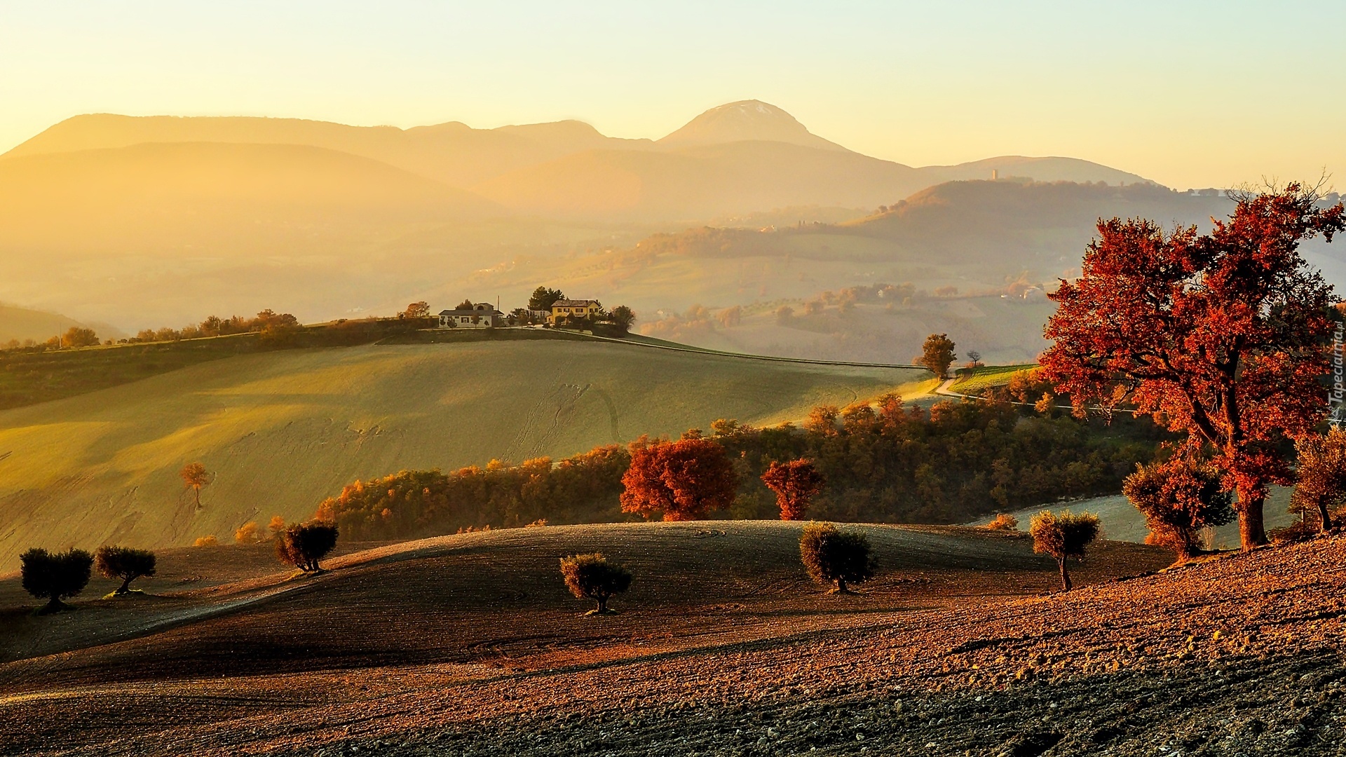 Edytor tapety: Wieś, Pola, Jesień, Góry, Drzewa
