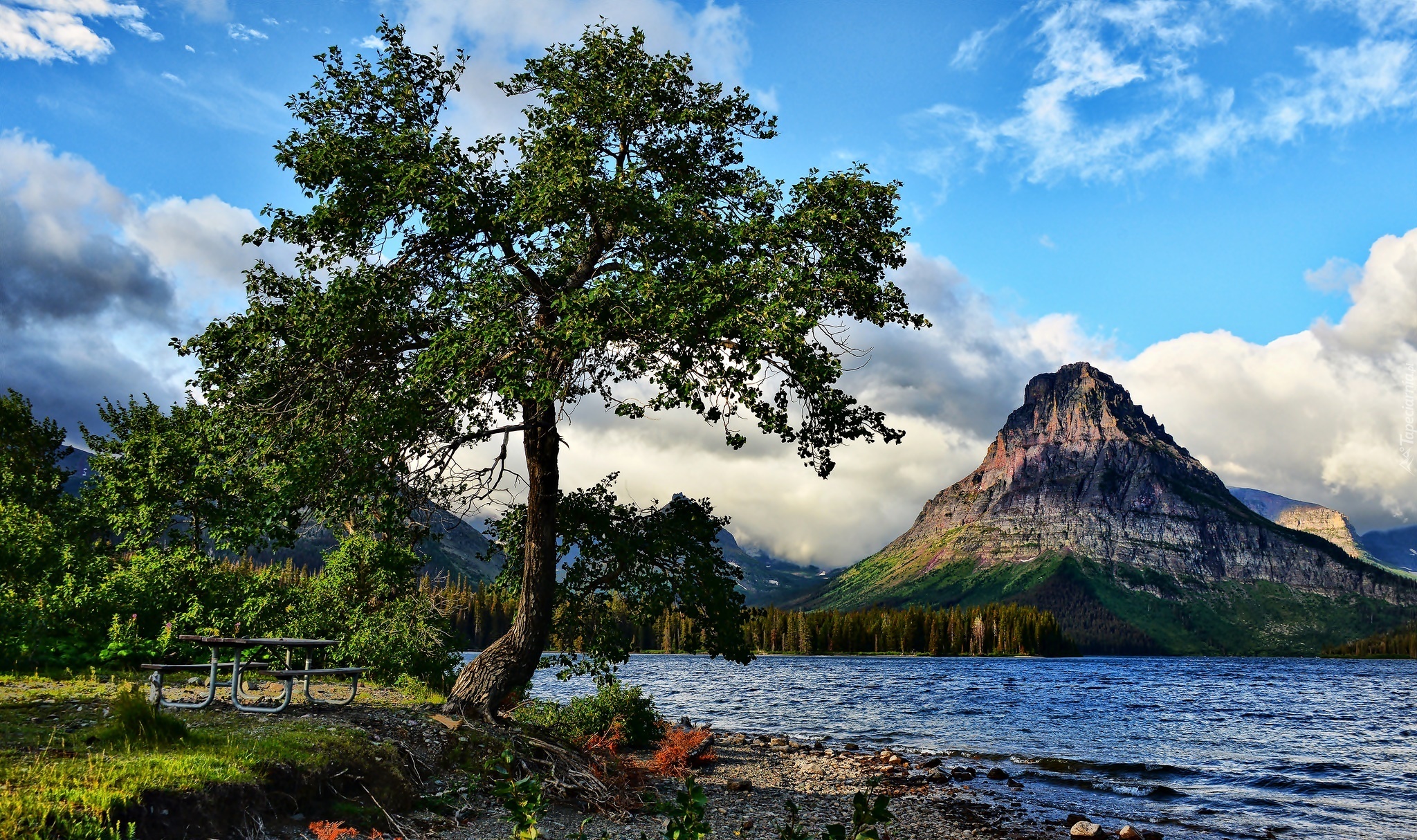 Edytor tapety: Góry, Jezioro, Brzeg, Drzewa, Ławka
