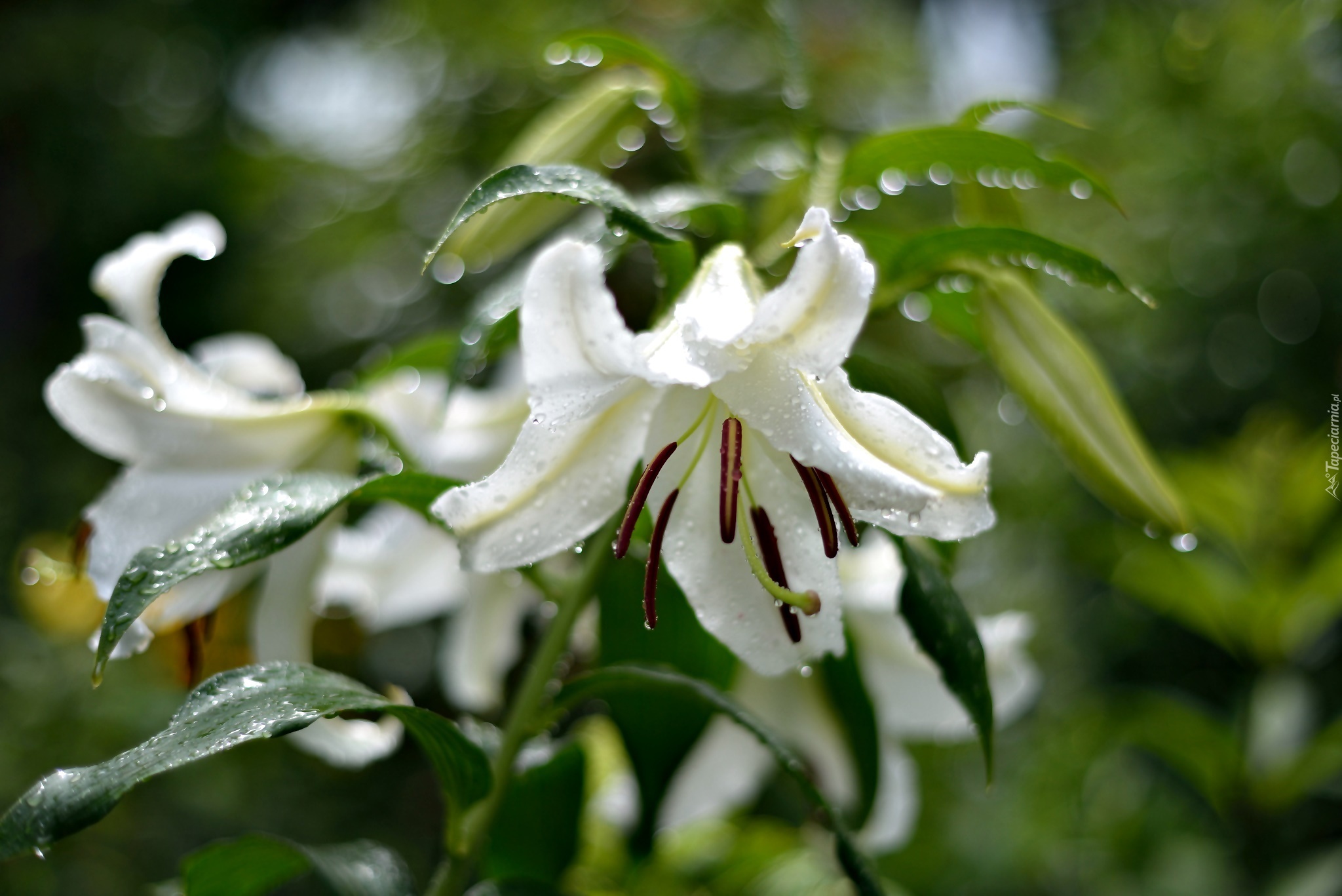 Edytor tapety: Lilie, Białe, Kwiaty, Bokeh, Deszcz