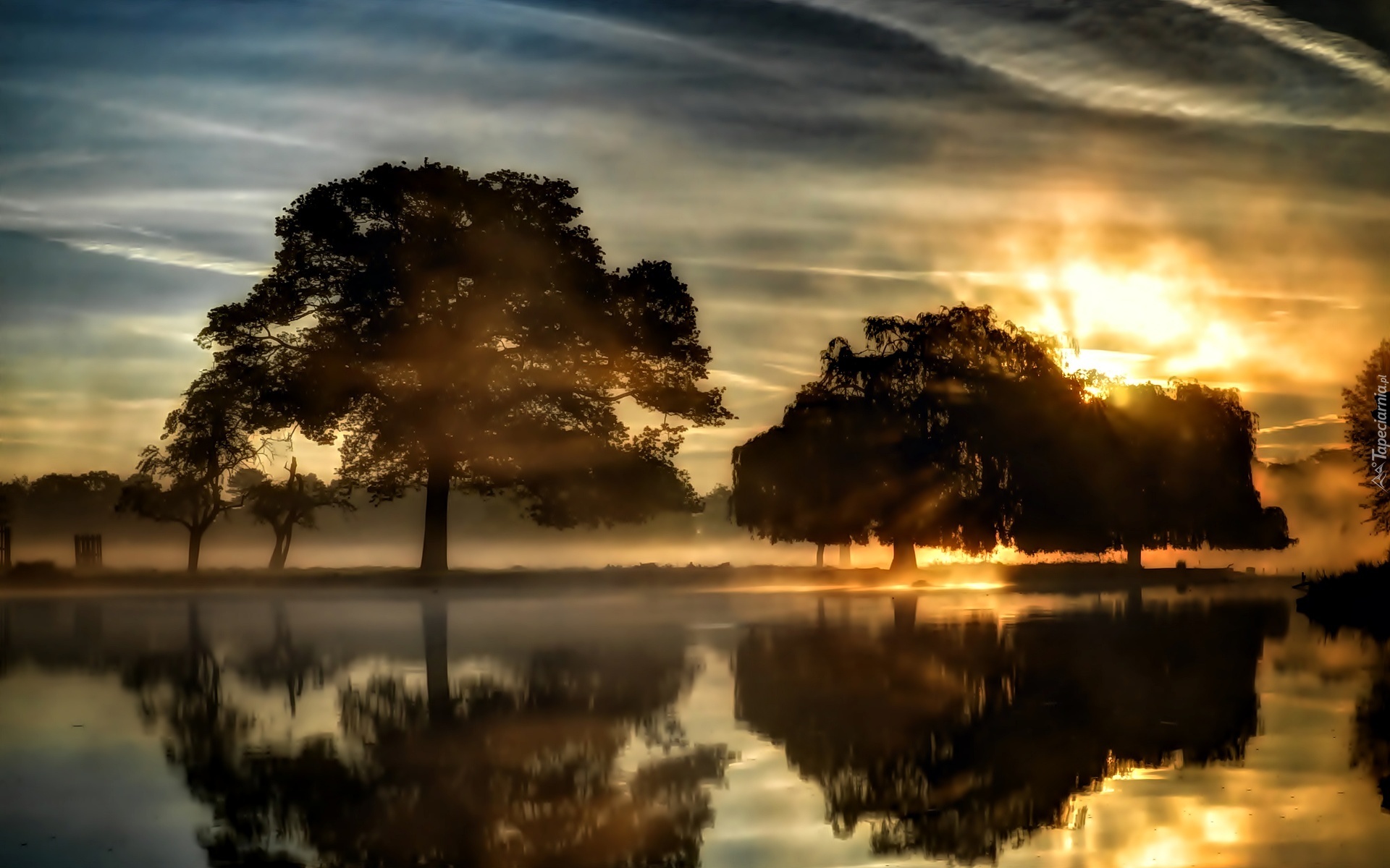Edytor tapety: Jezioro, Zachód Słońca, Drzewa, Odbicie