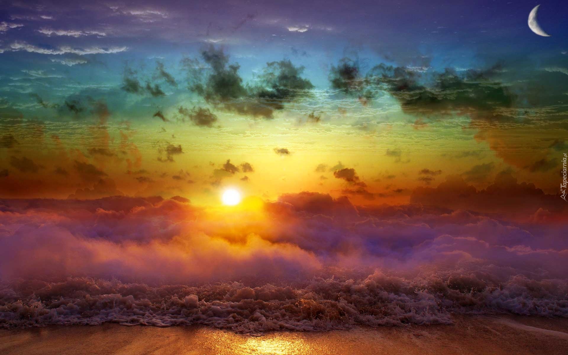 Edytor tapety: Fantasy, Zachód Słońca, Fale