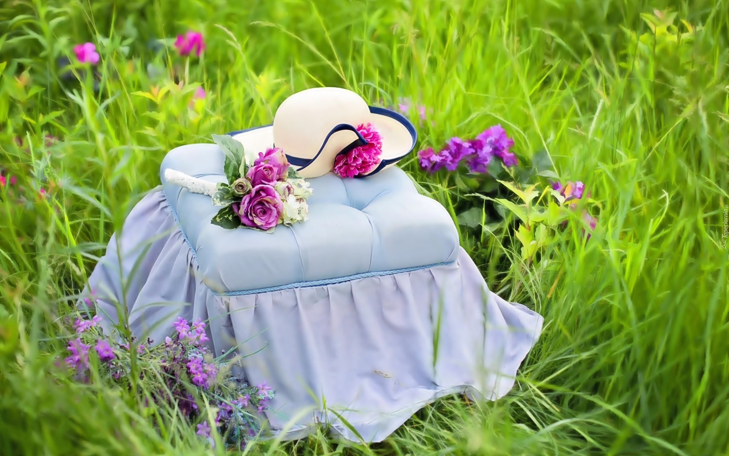 Edytor tapety: Łąka, Pufa, Kwiaty, Bukiecik, Róż, Kapelusz