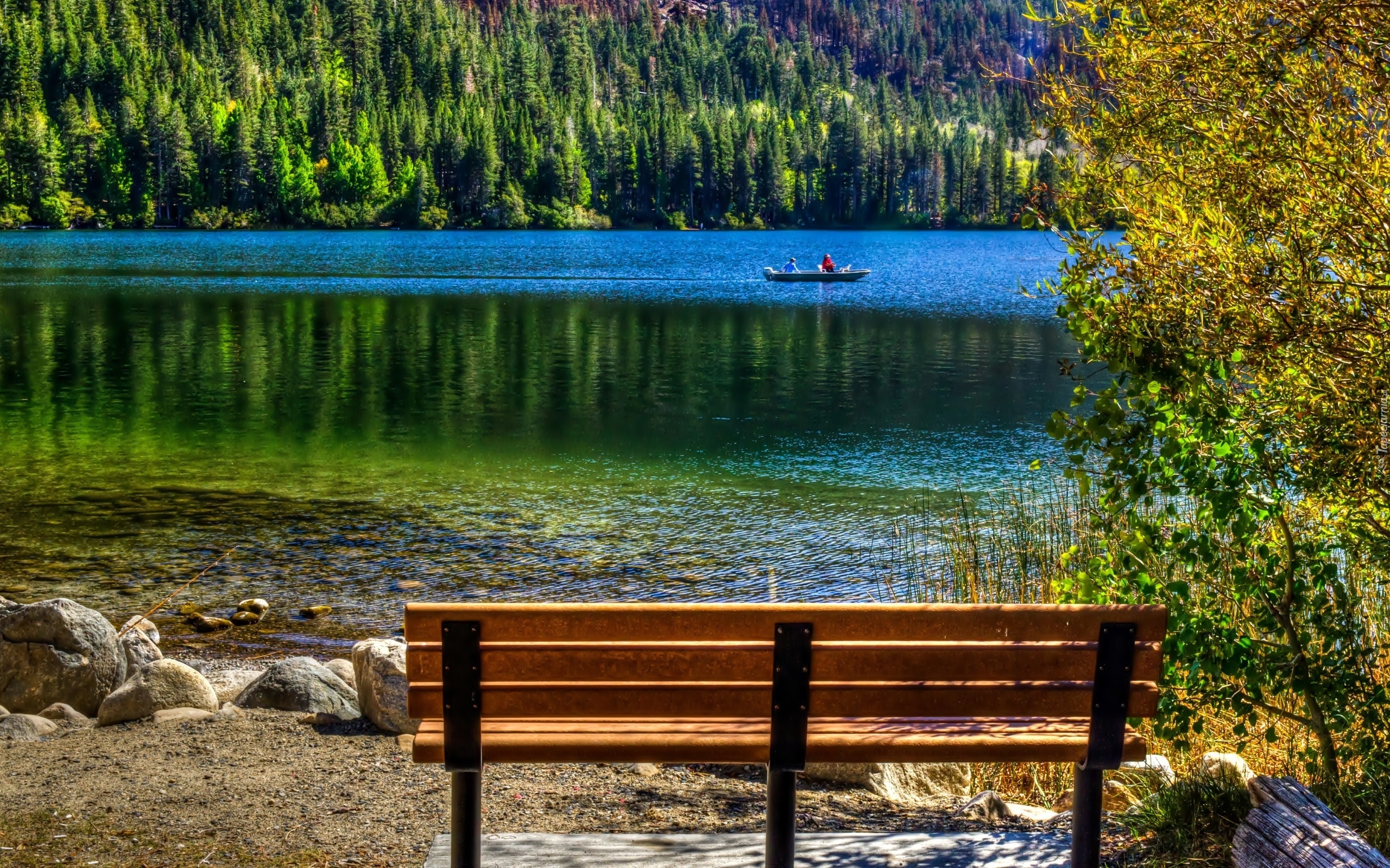 Edytor tapety: Jezioro, Łódka, Ławka, Lasy