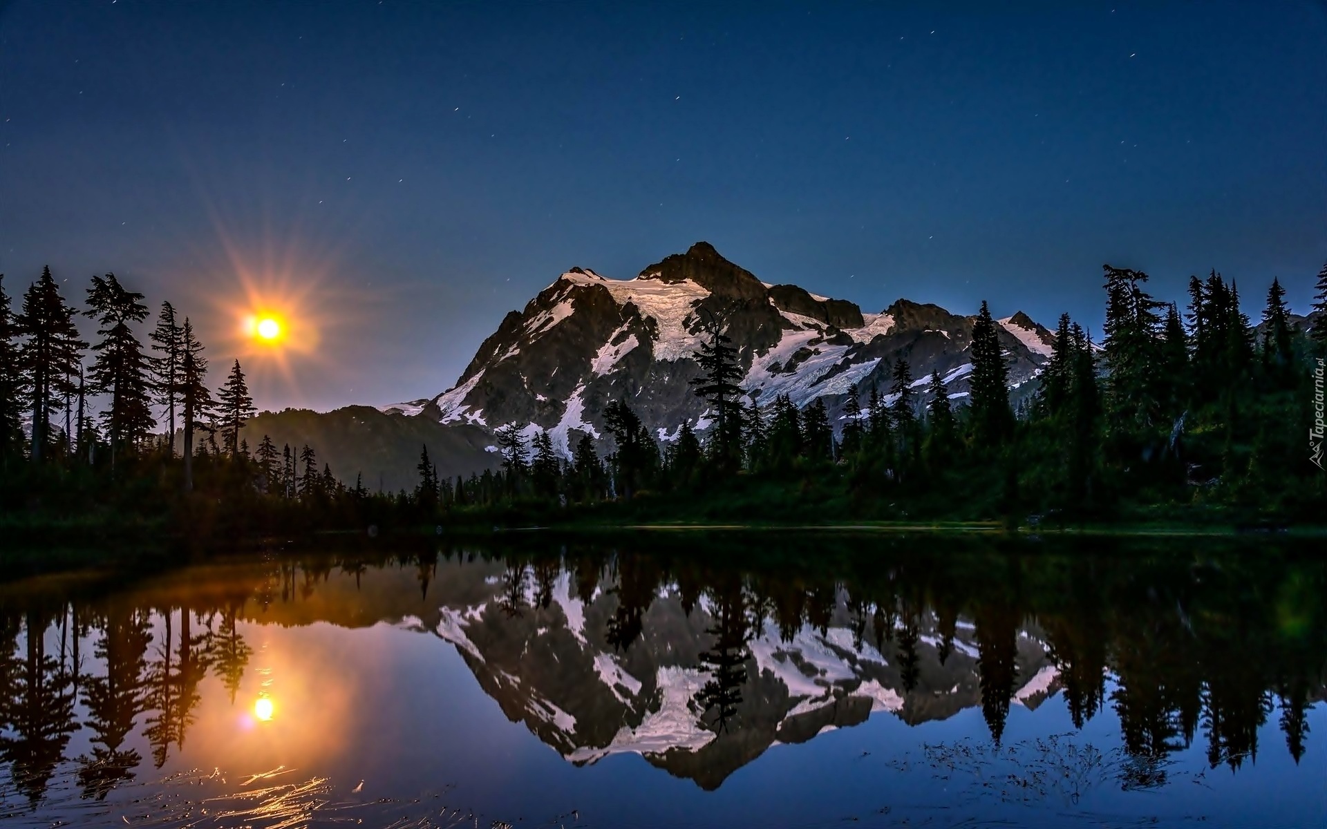 Edytor tapety: Zachód Słońca, Góry, Jezioro, Drzewa