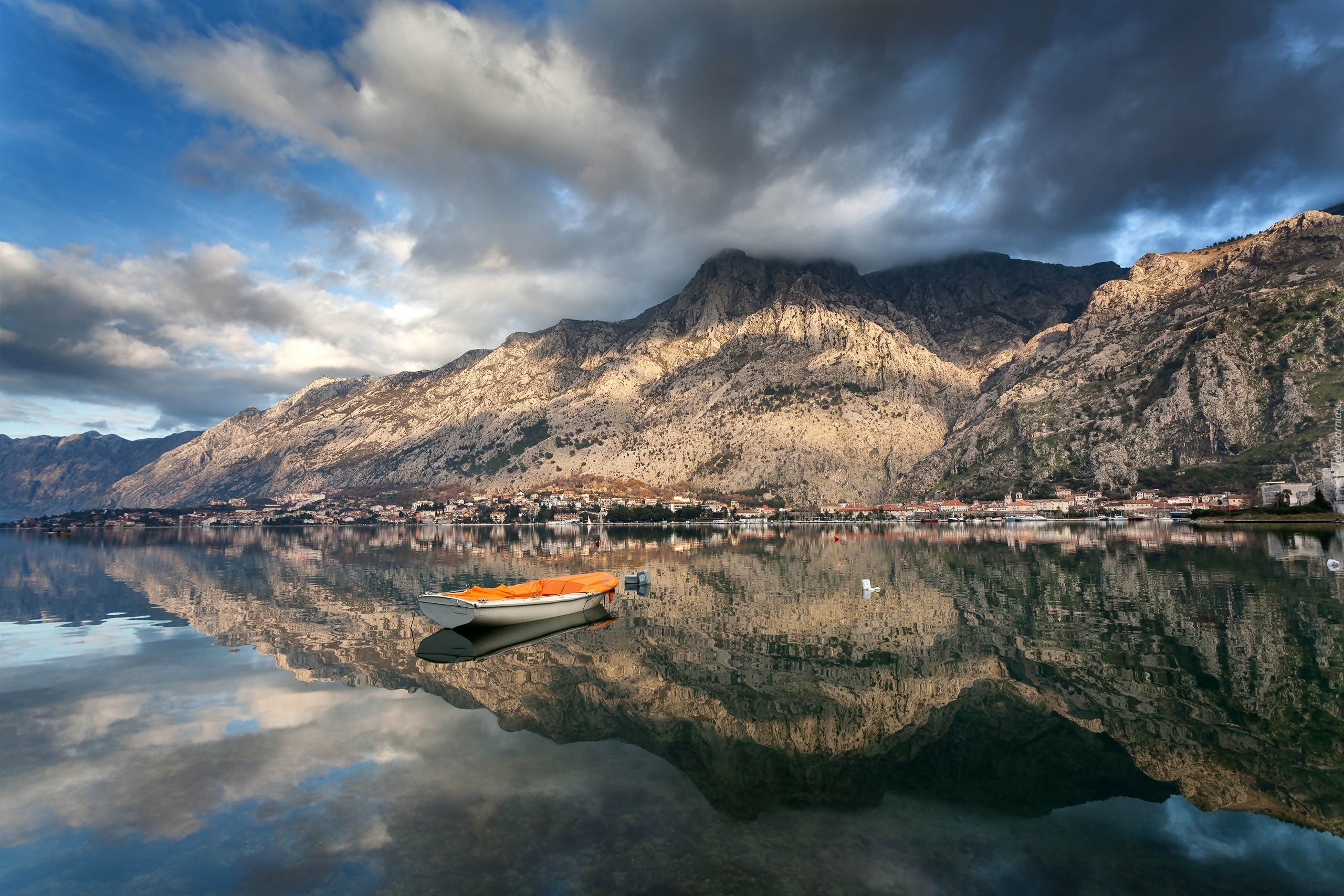 Edytor tapety: Jezioro, Góry, Domy, Łódka, Odbicie