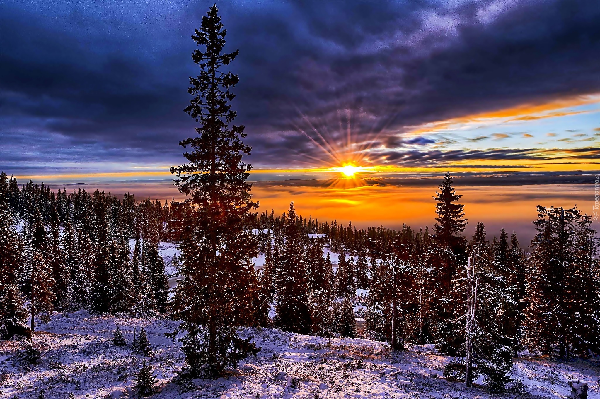 Edytor tapety: Zima, Las, Chmury, Promienie, Zachód słońca