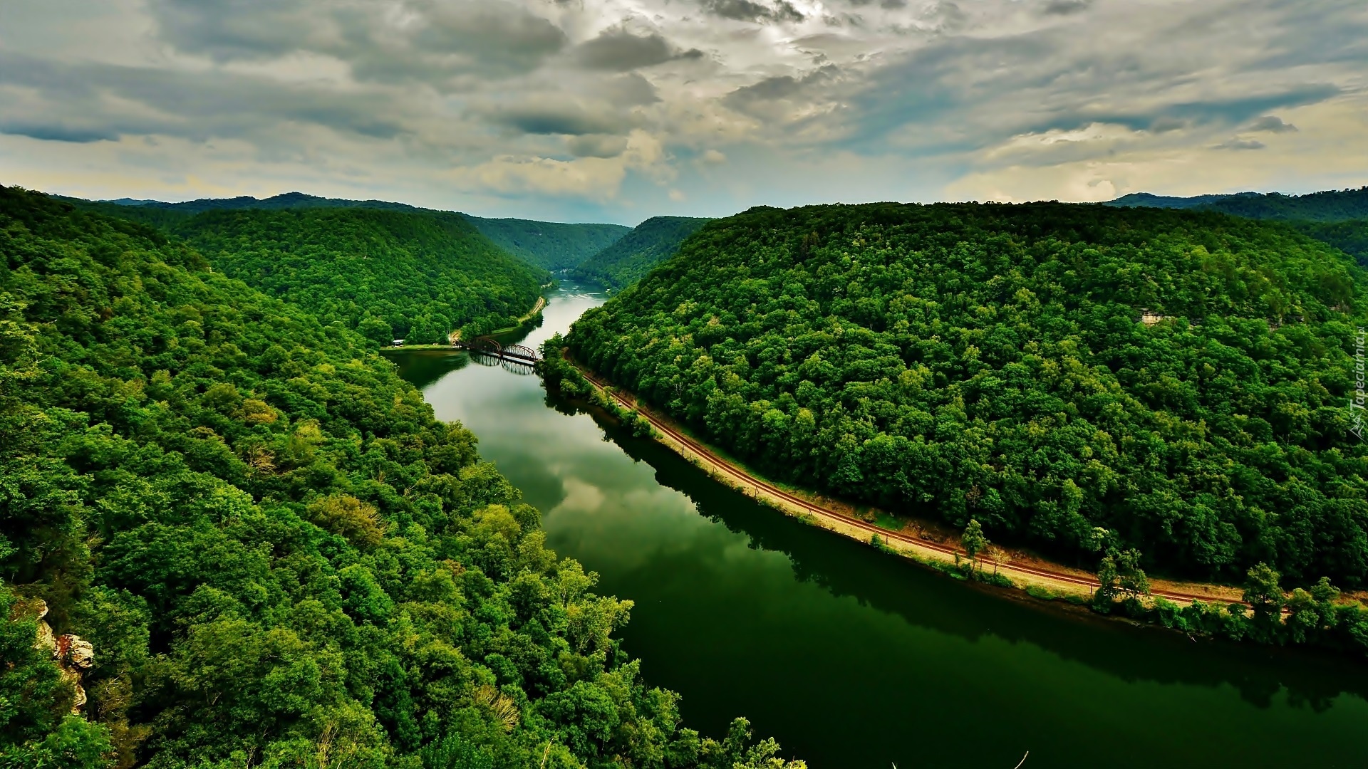 Edytor tapety: Góry, Lasy, Rzeka, Droga, Most, Wzgórza