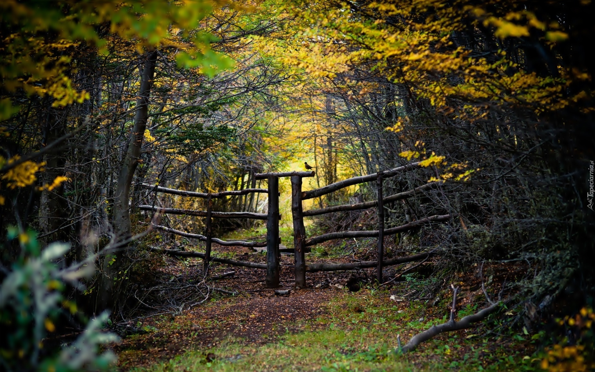 Edytor tapety: Las, Droga, Ogrodzenie, Ptaszek, Jesień