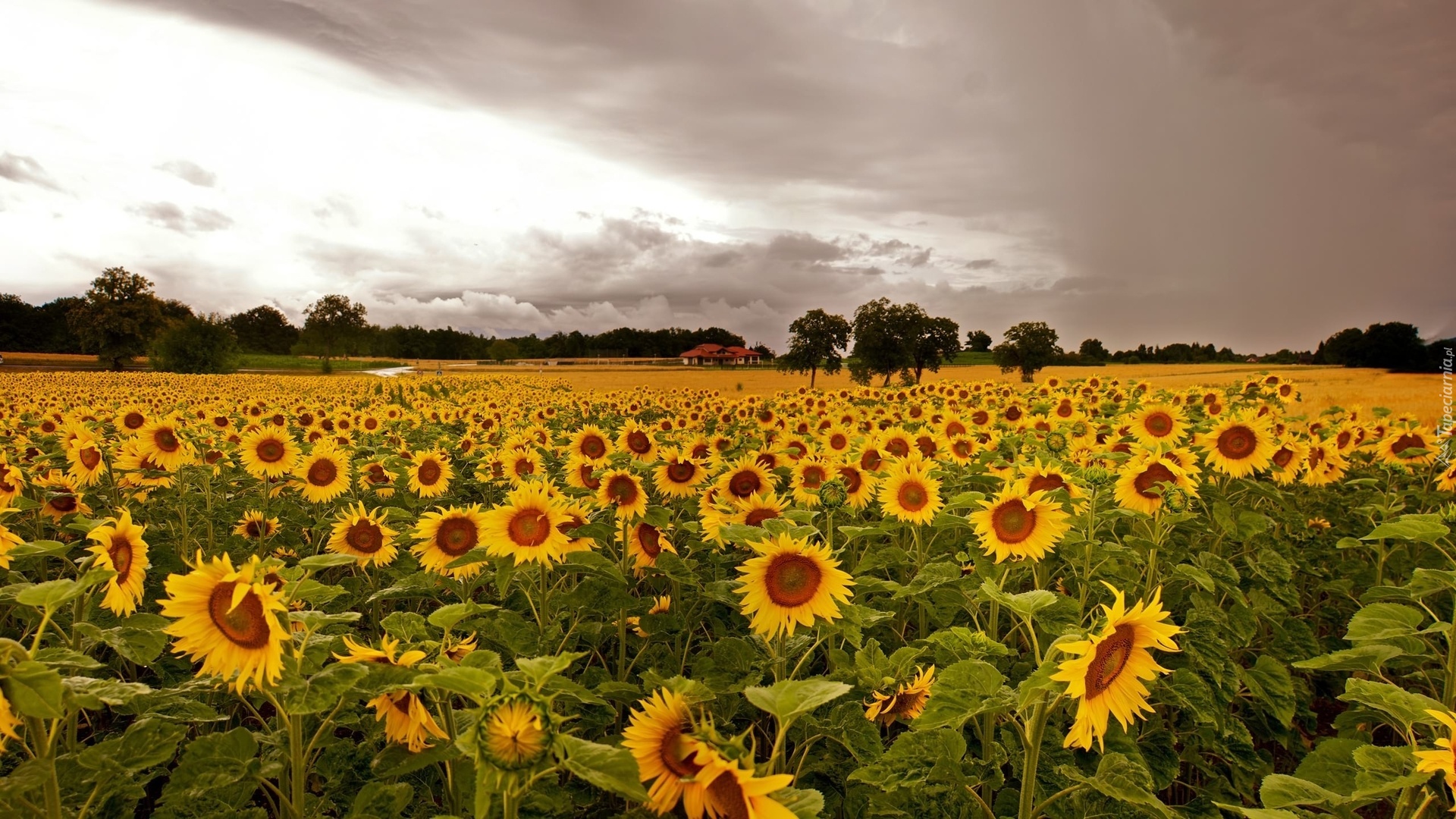 Edytor tapety: Domek, Drzewa, Słoneczniki