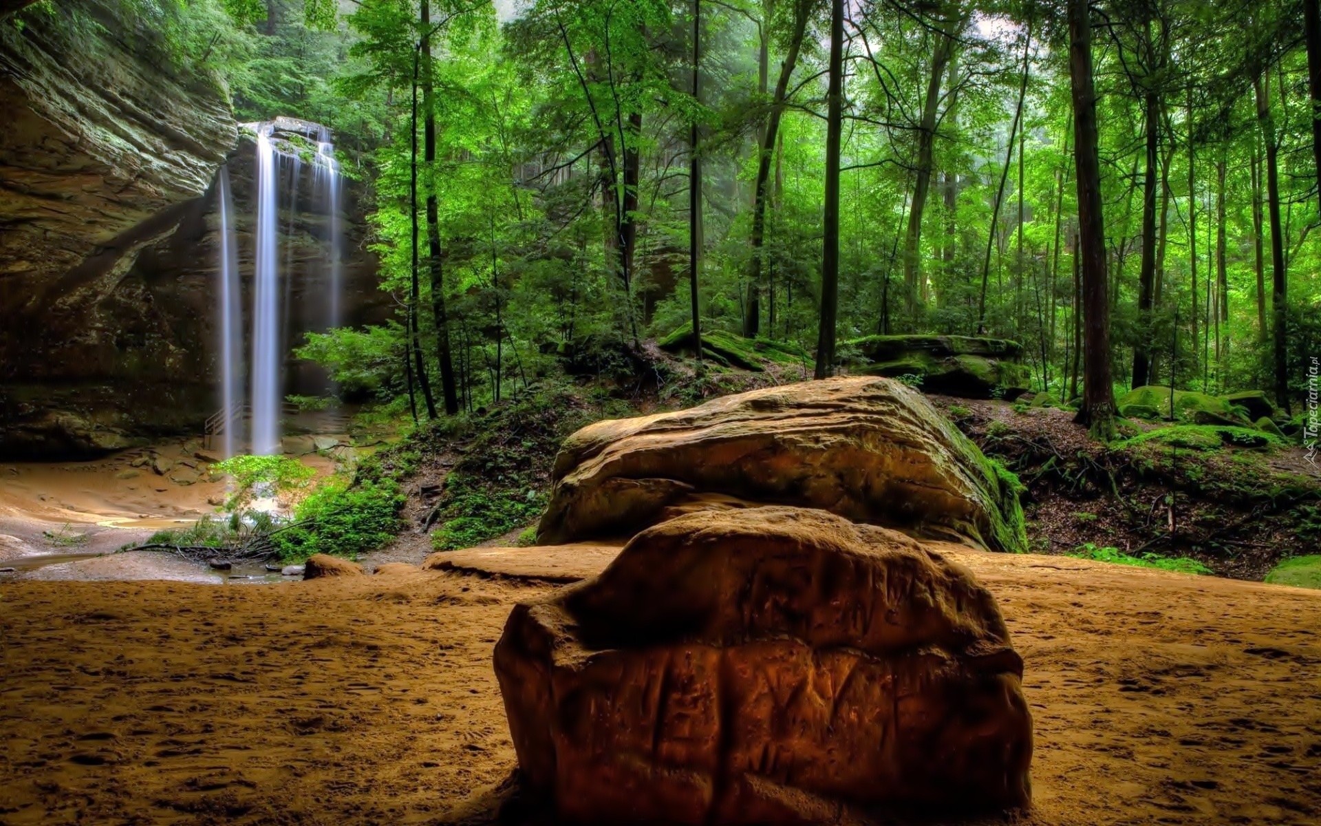 Edytor tapety: Wodospad, Las, Góry, Rzeka, Głazy, Drzewa