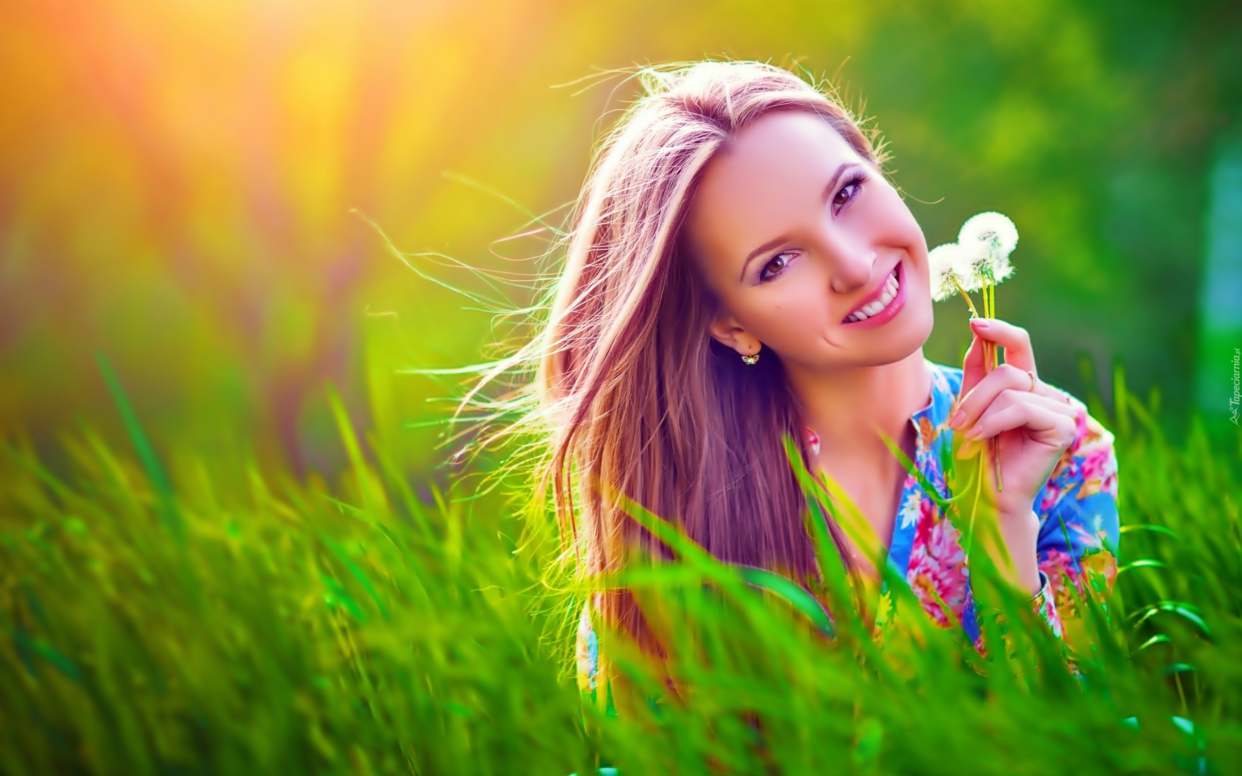 Edytor tapety: Kobieta, Makijaż, Biżuteria, Łąka, Trawa, Mniszek