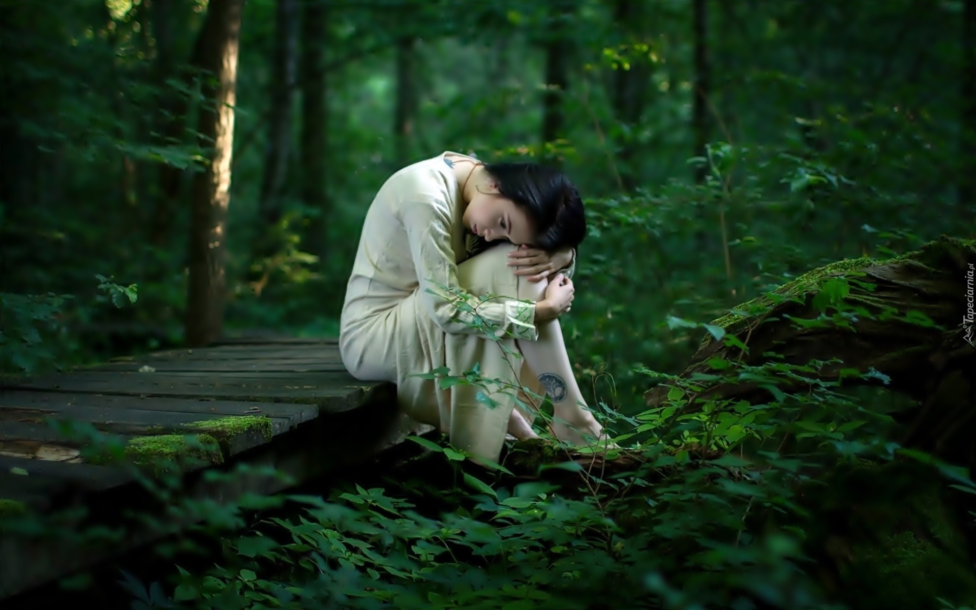Edytor tapety: Smutna, Dziewczyna, Ścieżka, Las, Drzewa, Krzewy