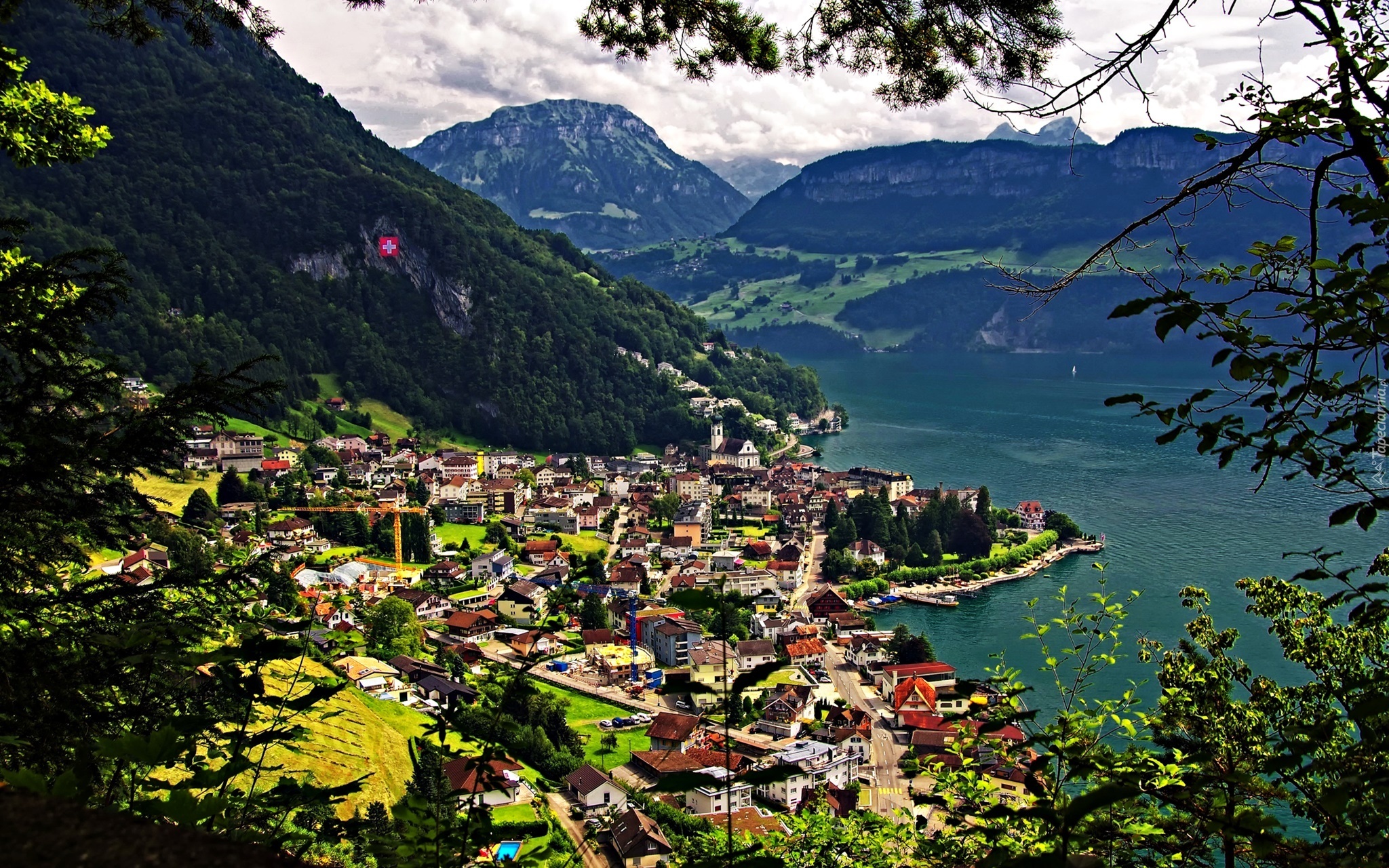 Edytor tapety: Gersau, Szwajcaria, Miasto, Jezioro, Góry, Panorama