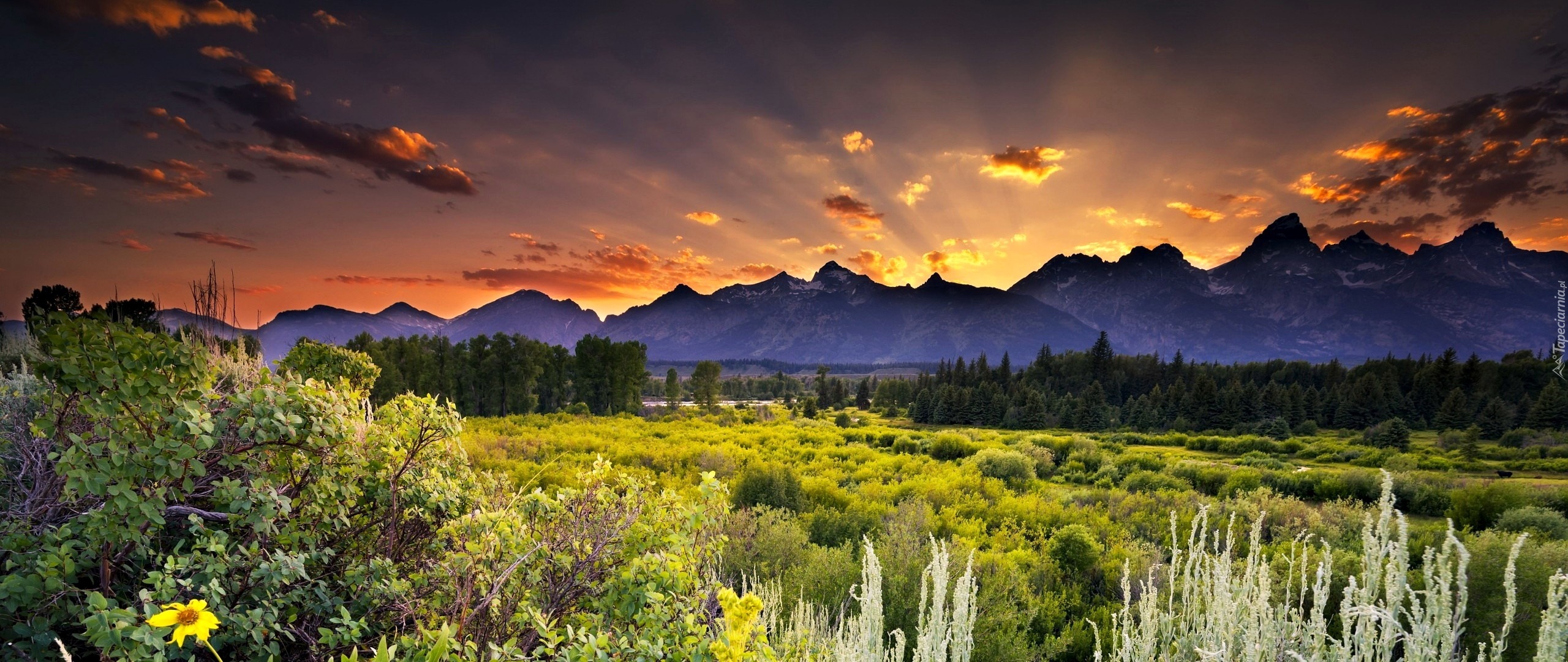 Edytor tapety: Góry, Zachód Słońca, Łąka