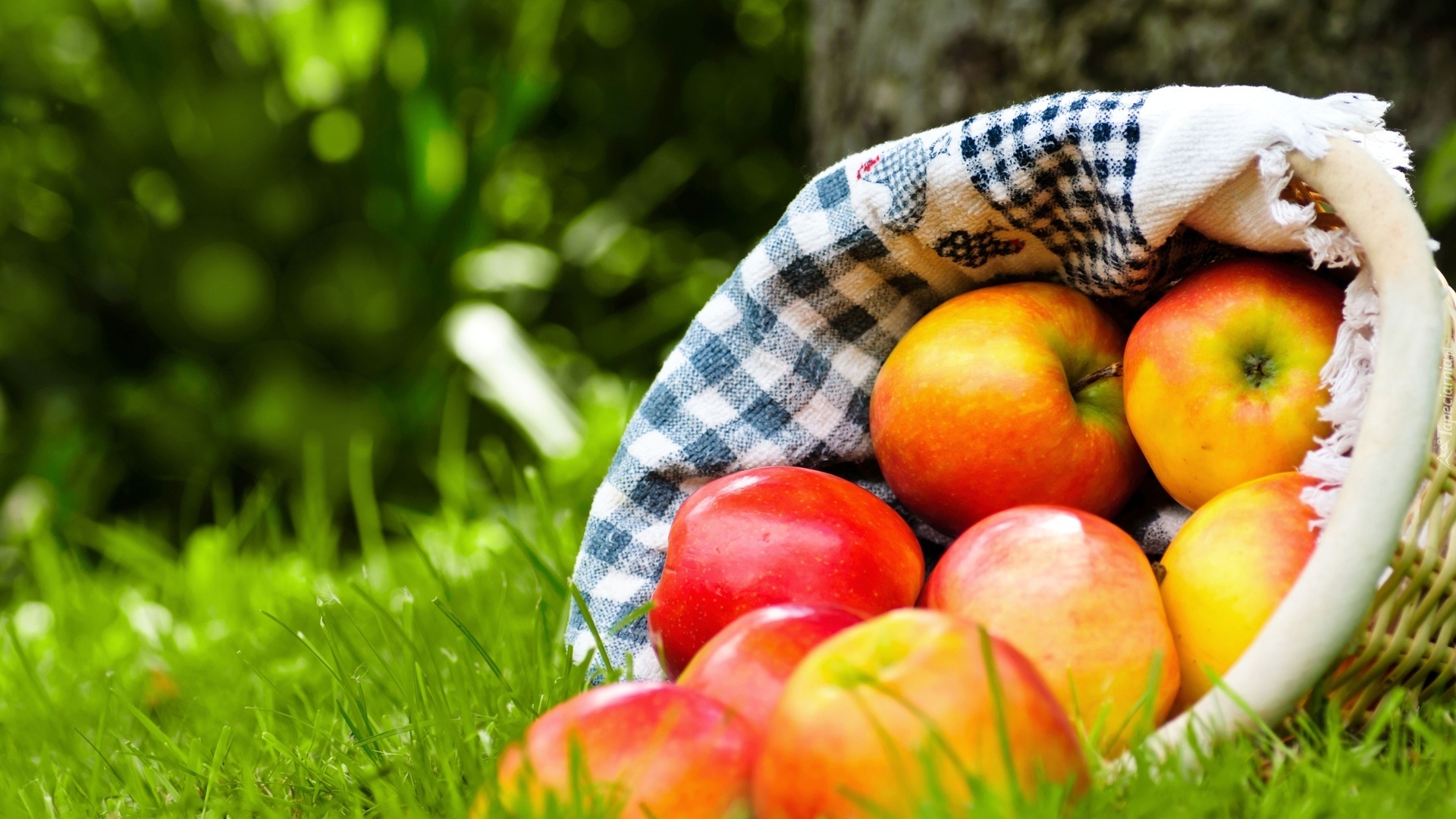 Edytor tapety: Jabłka, W, Koszyku, Na, Trawie