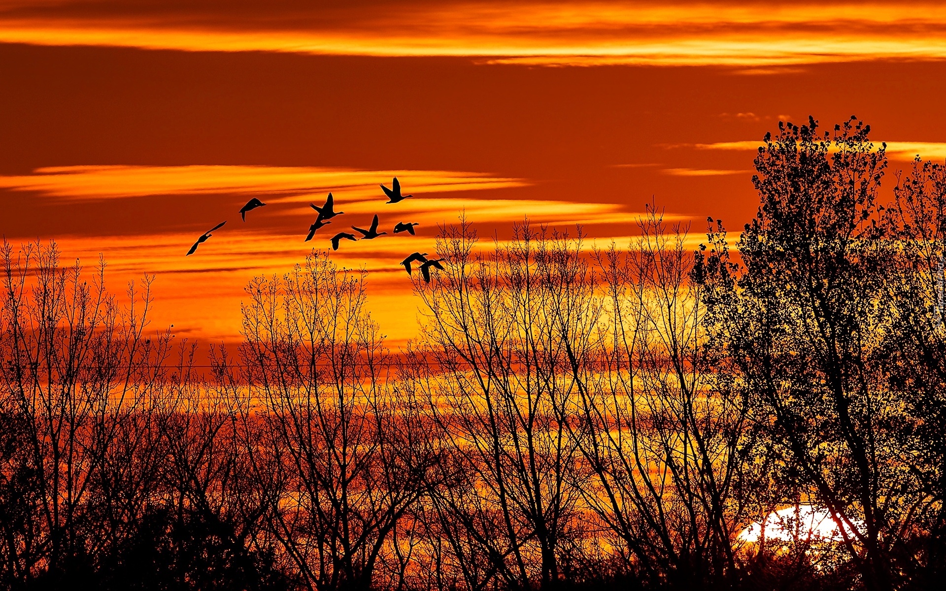 Edytor tapety: Zachód Słońca, Drzewa, Ptaki