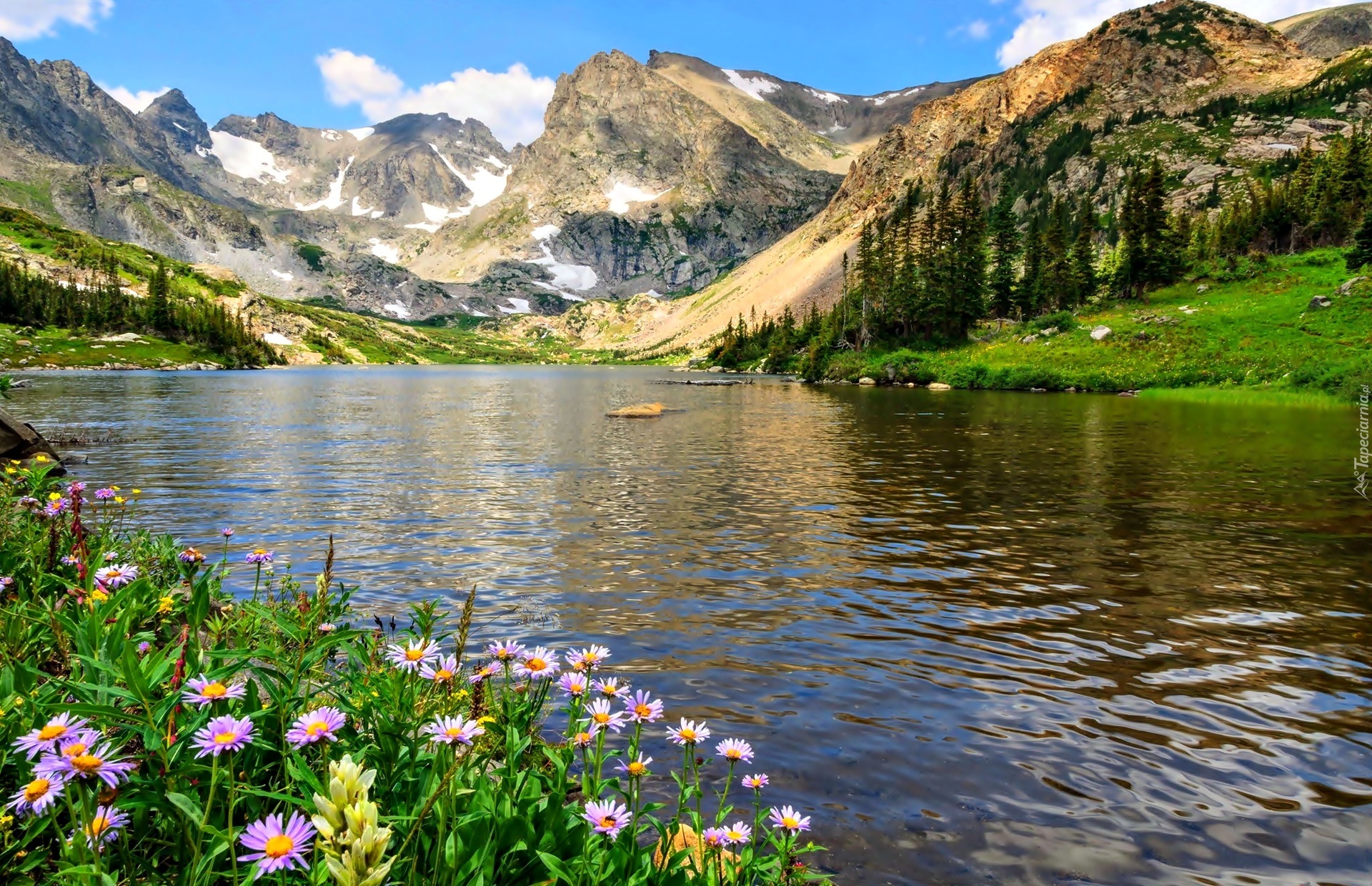Edytor tapety: Góry, Rzeka, Drzewa, Kwiaty
