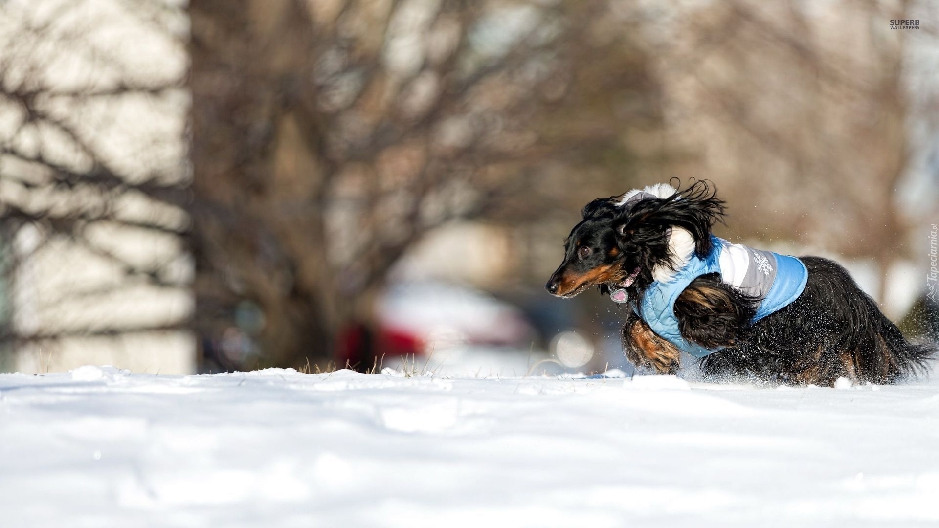 Edytor tapety: Zima, Śnieg, Jamnik, Długowsłosy