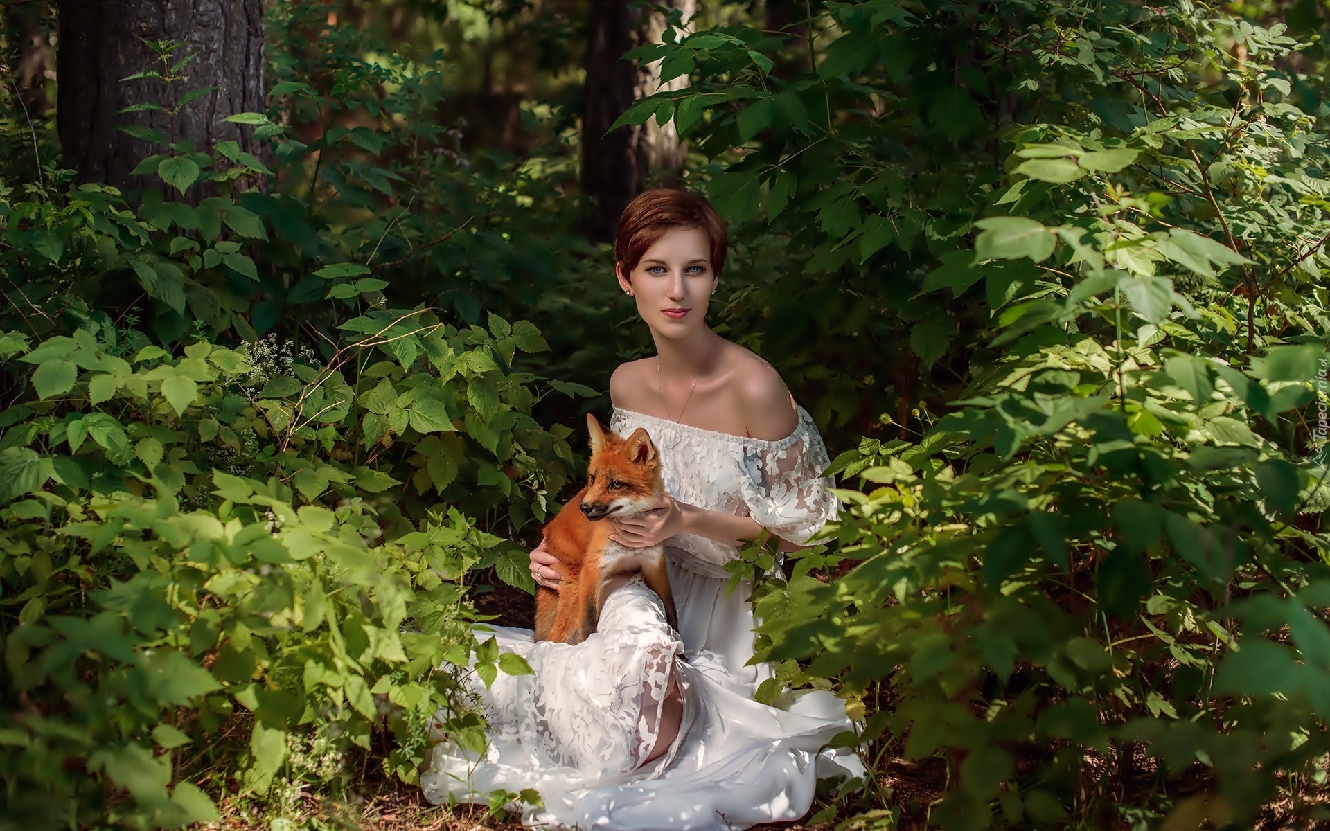 Edytor tapety: Kobieta, Las, Drzewa, Krzewy, Mały, Lisek