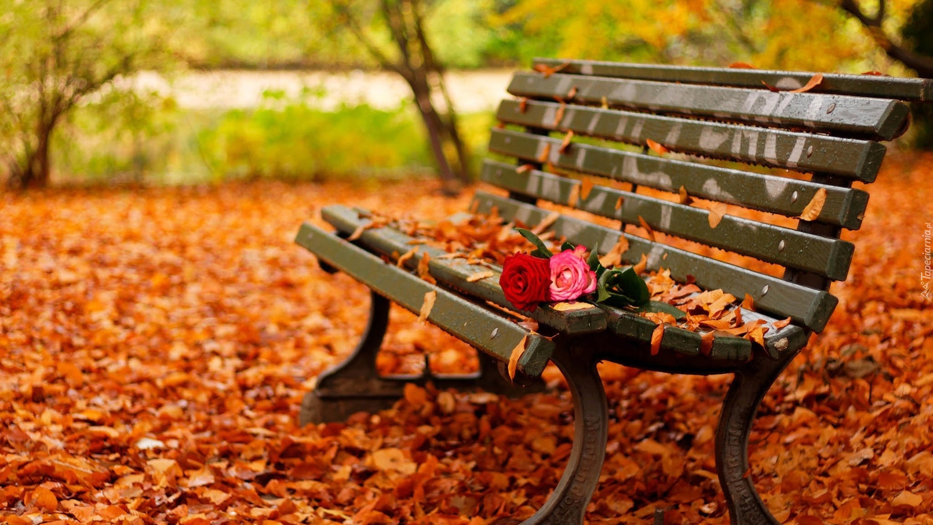 Edytor tapety: Jesień, Park, Ławka, Liście, Róże, Staw