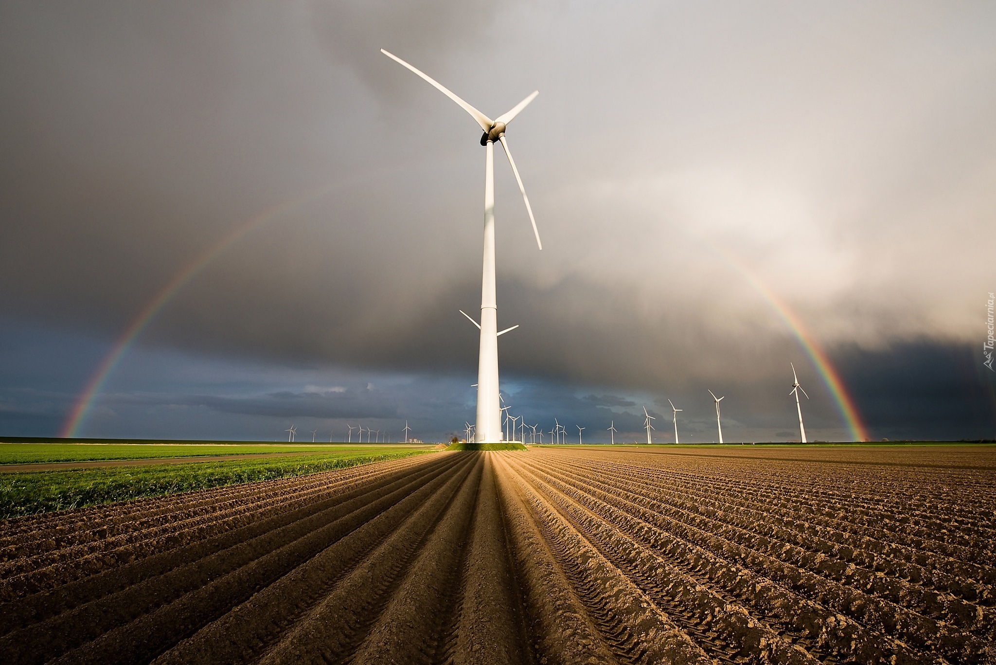 Edytor tapety: Turbiny Wiatrowe, Pole, Tęcza, Krajobraz