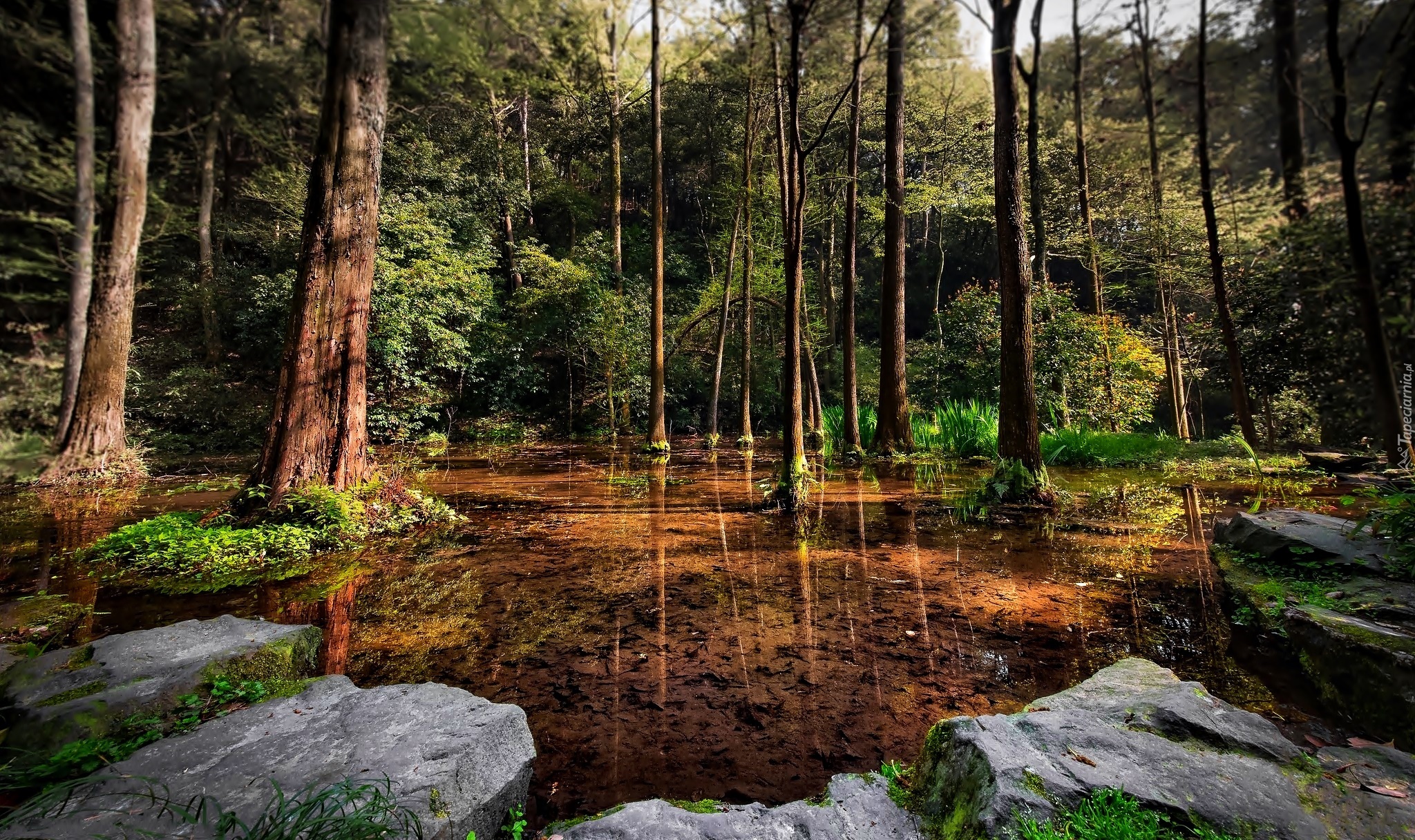 Edytor tapety: Las, Rozlewisko, Kamienie, Przebijające Światło
