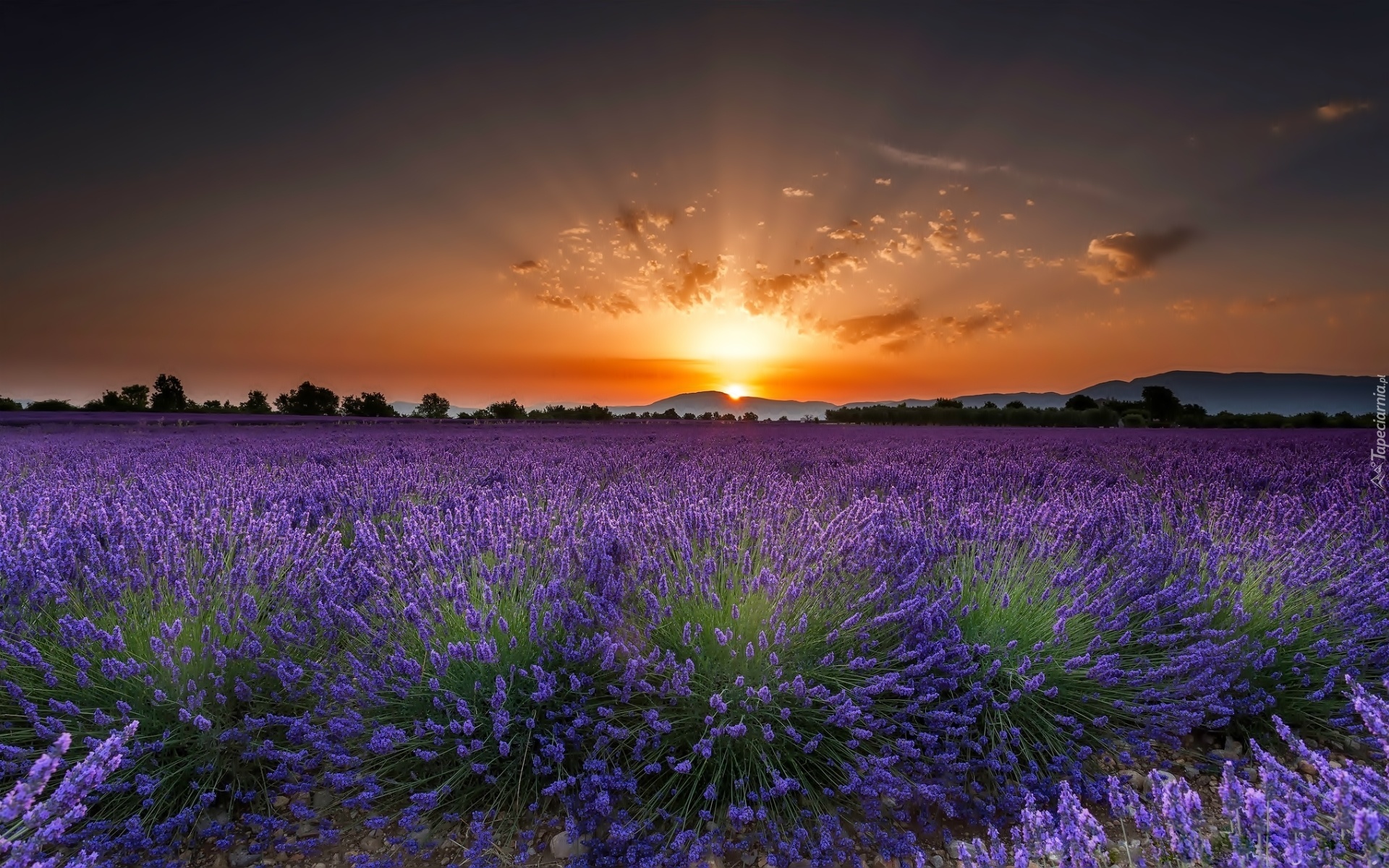 Edytor tapety: Pole, Lawendowe, Drzewa, Góry, Zachód, Słońca