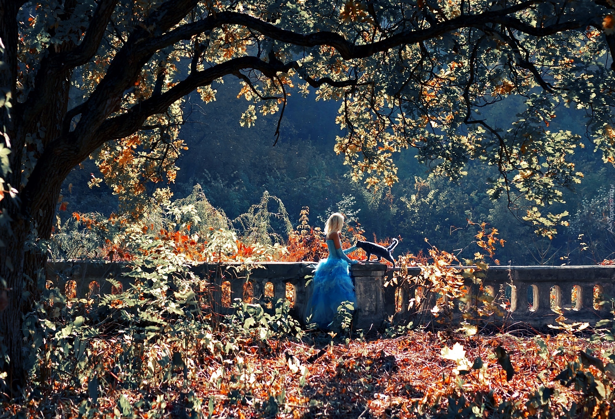 Edytor tapety: Jesień, Drzewa, Kobieta, Kot, Balustrada