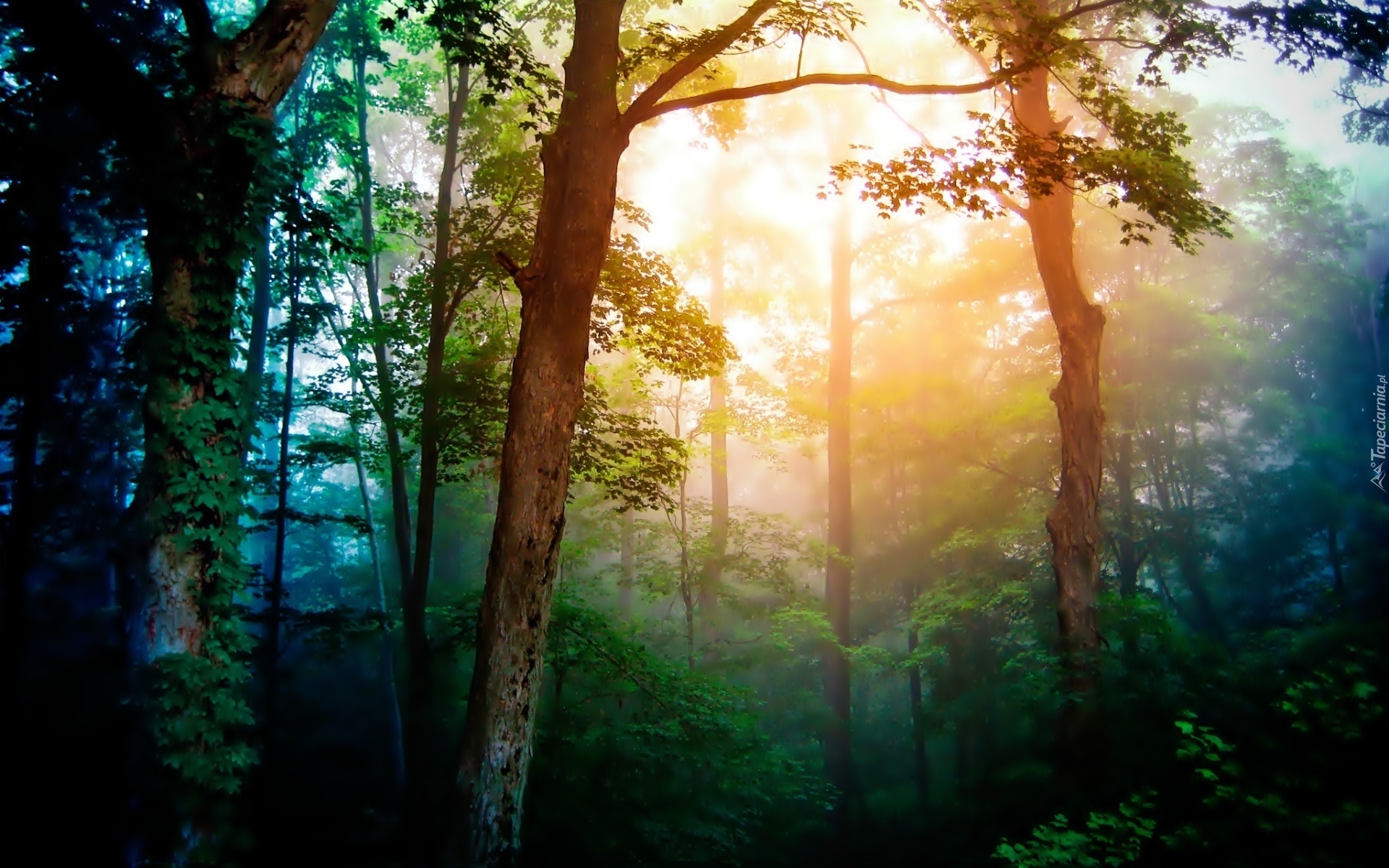 Edytor tapety: Las, Drzewa, Mgła, Przebijające, Światło, Poranek