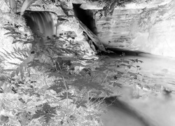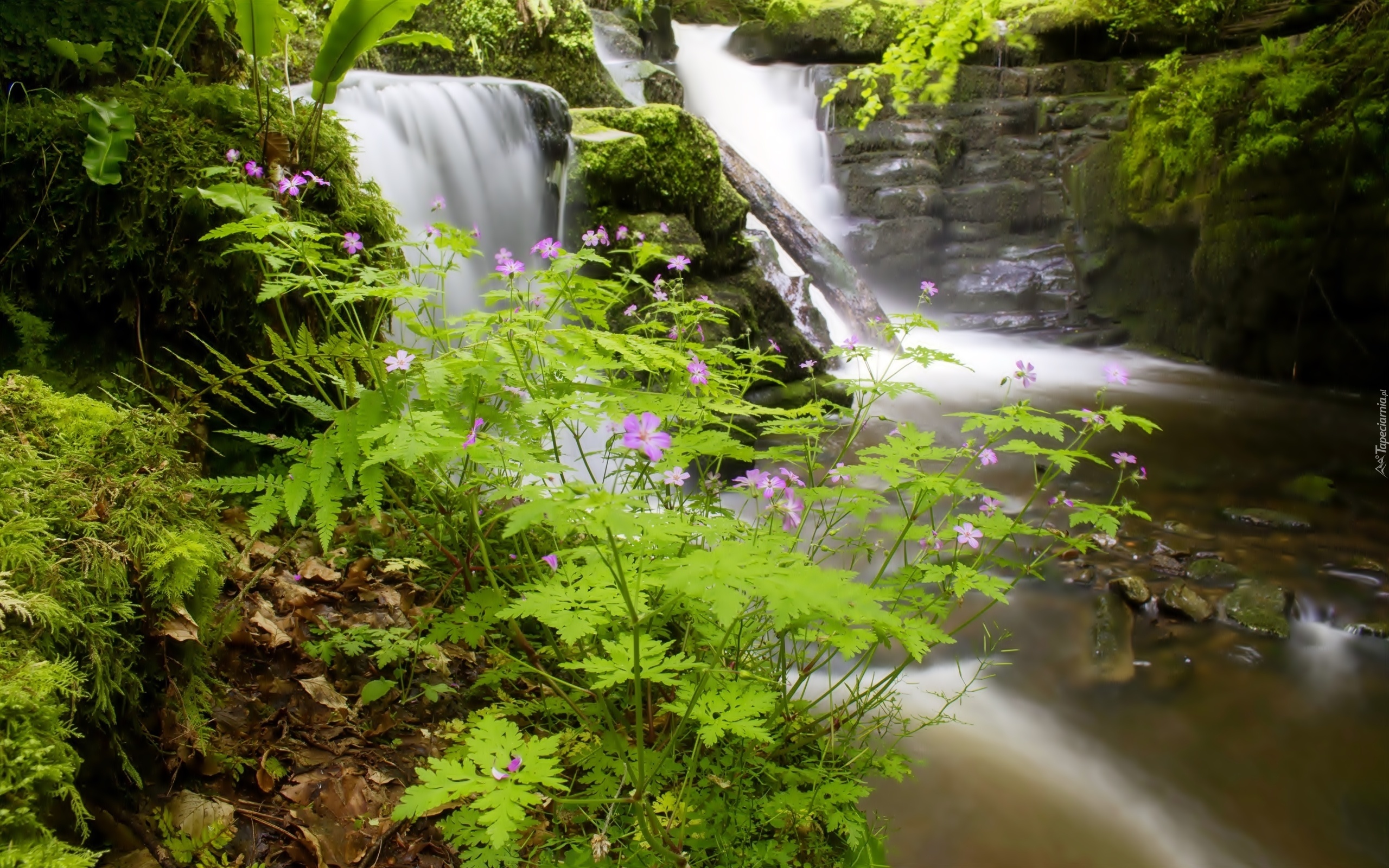 Edytor tapety: Wodospad, Kamienie, Krzewy, Kwiaty, Rzeka