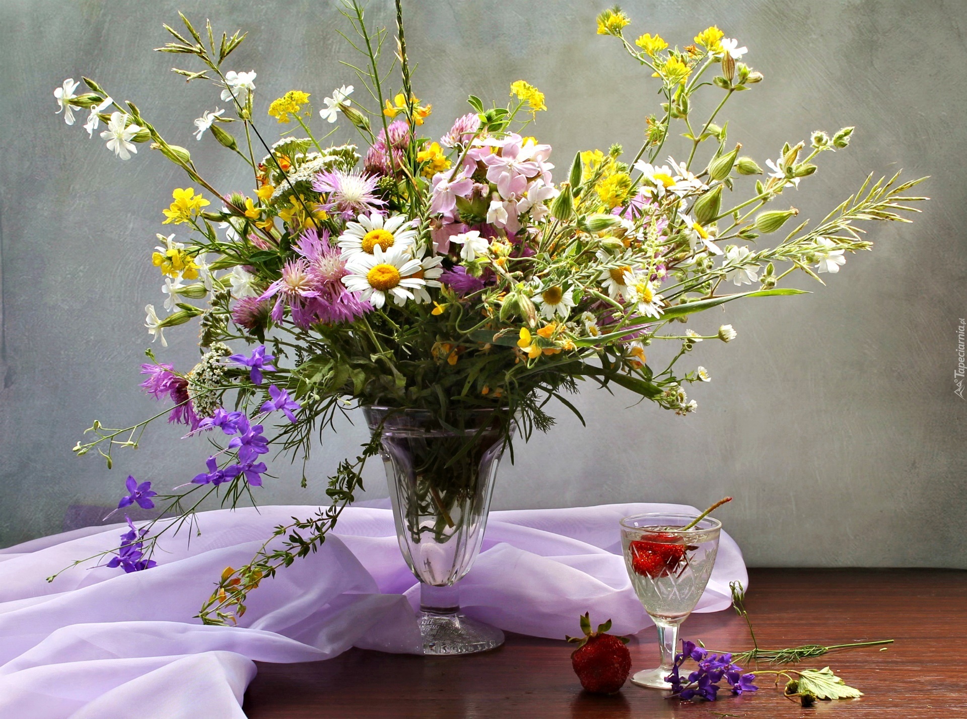 Edytor tapety: Bukiet Polnych Kwiatów, Tkanina, Kieliszek, Truskawki, Kompozycja