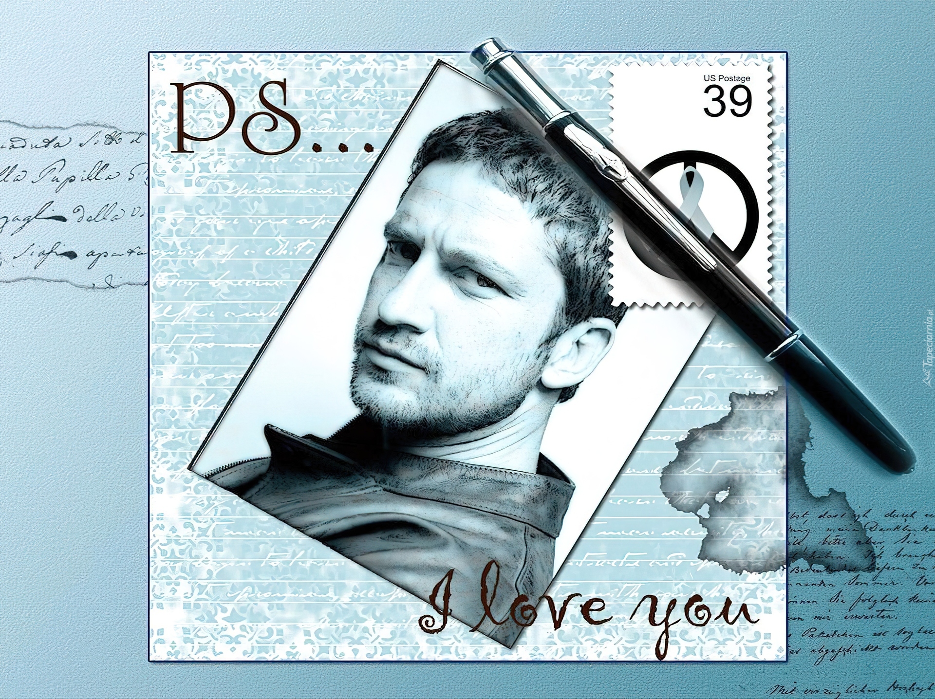 Edytor tapety: Gerard Butler,długopis, znaczek
