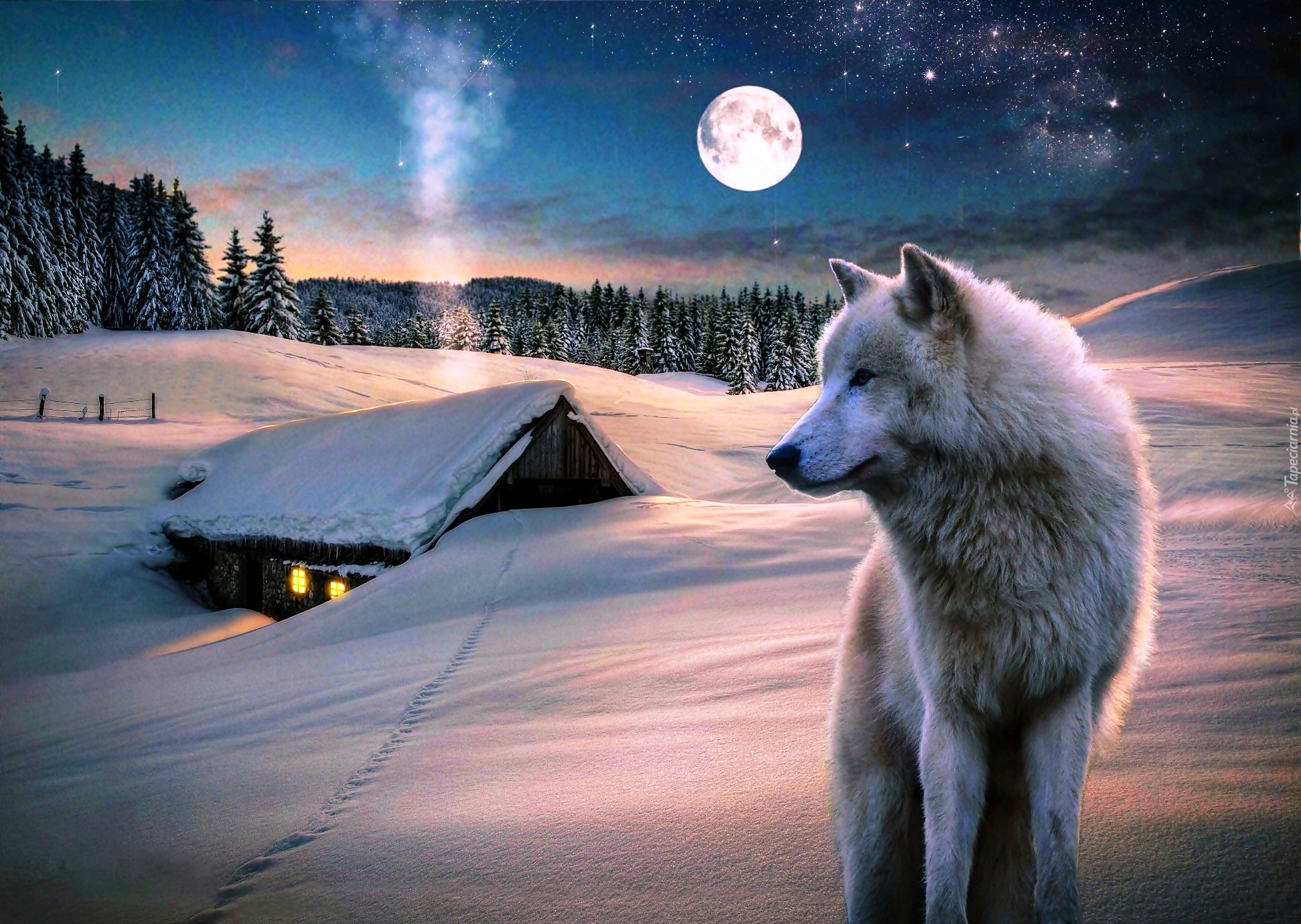 Edytor tapety: Wilk, Dom, Zima, Las, Księżyc, Fantasy