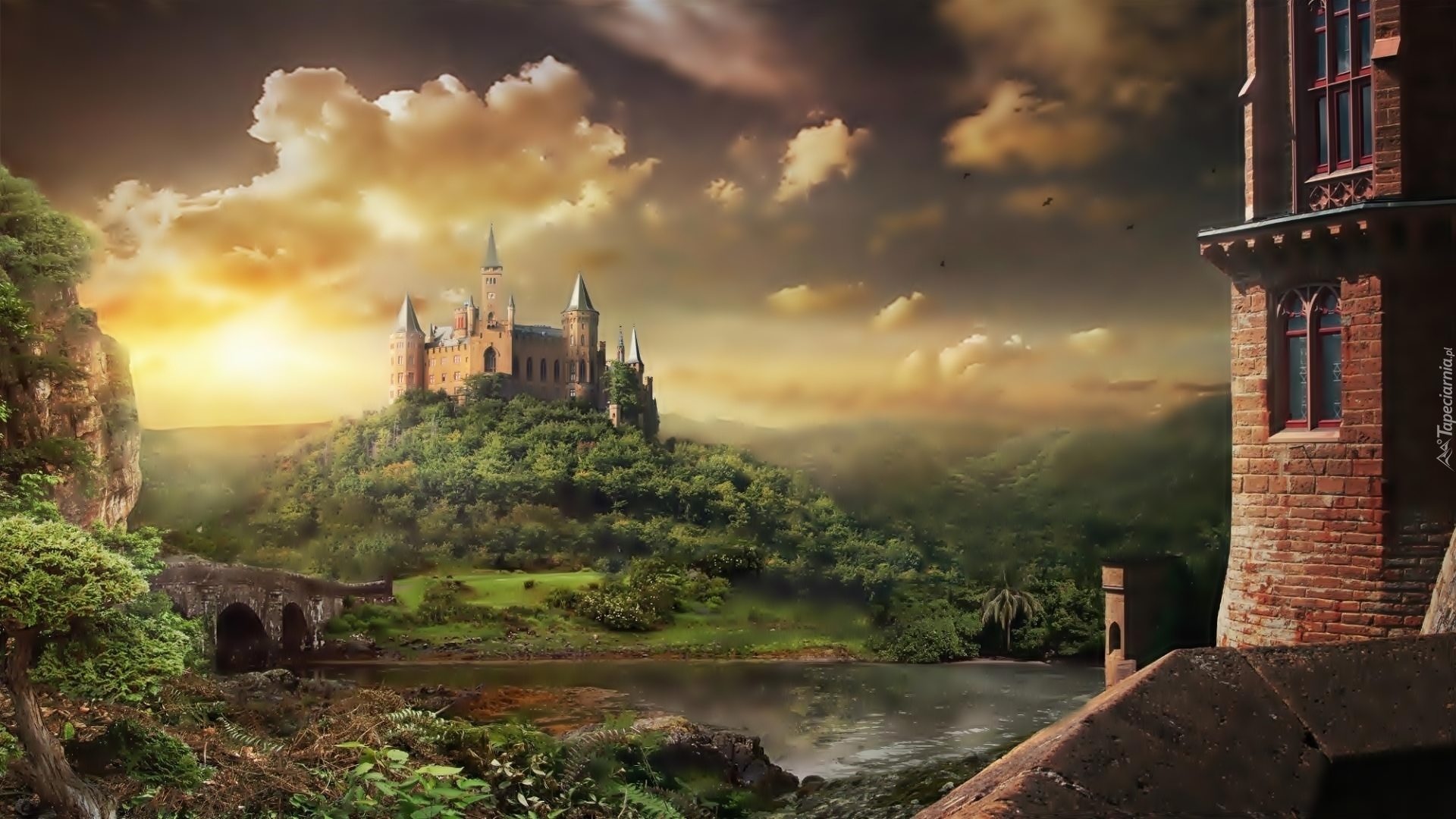 Edytor tapety: Fantasy, Zamek, Wzgórze, Rzeka, Most, Skały
