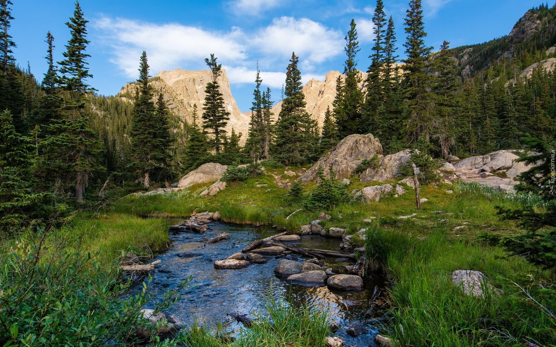 Edytor tapety: Góry, Skały, Kamienie, Rzeka, Polana, Iglaki