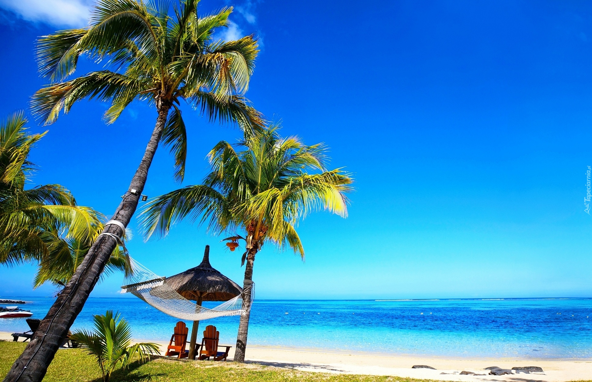 Edytor tapety: Morze, Plaża, Palmy, Hamak