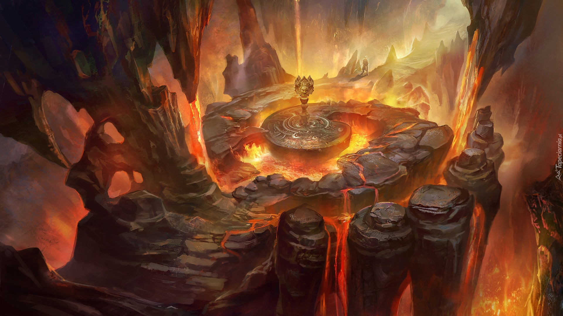 Edytor tapety: Fantasy, Jaskinia, Skały, Ogień, Lawa, Statua