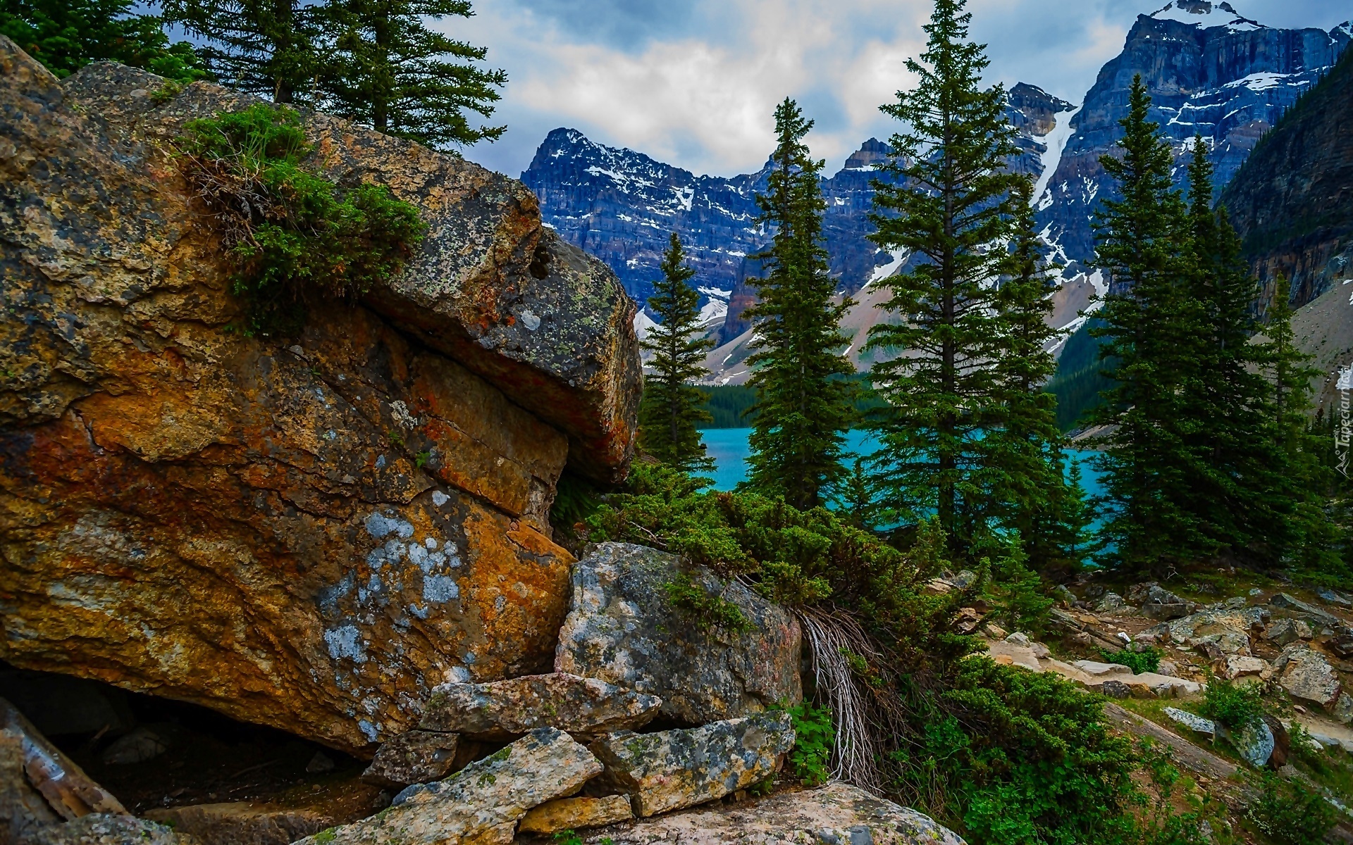 Edytor tapety: Góry, Skały, Drzewa, Jezioro