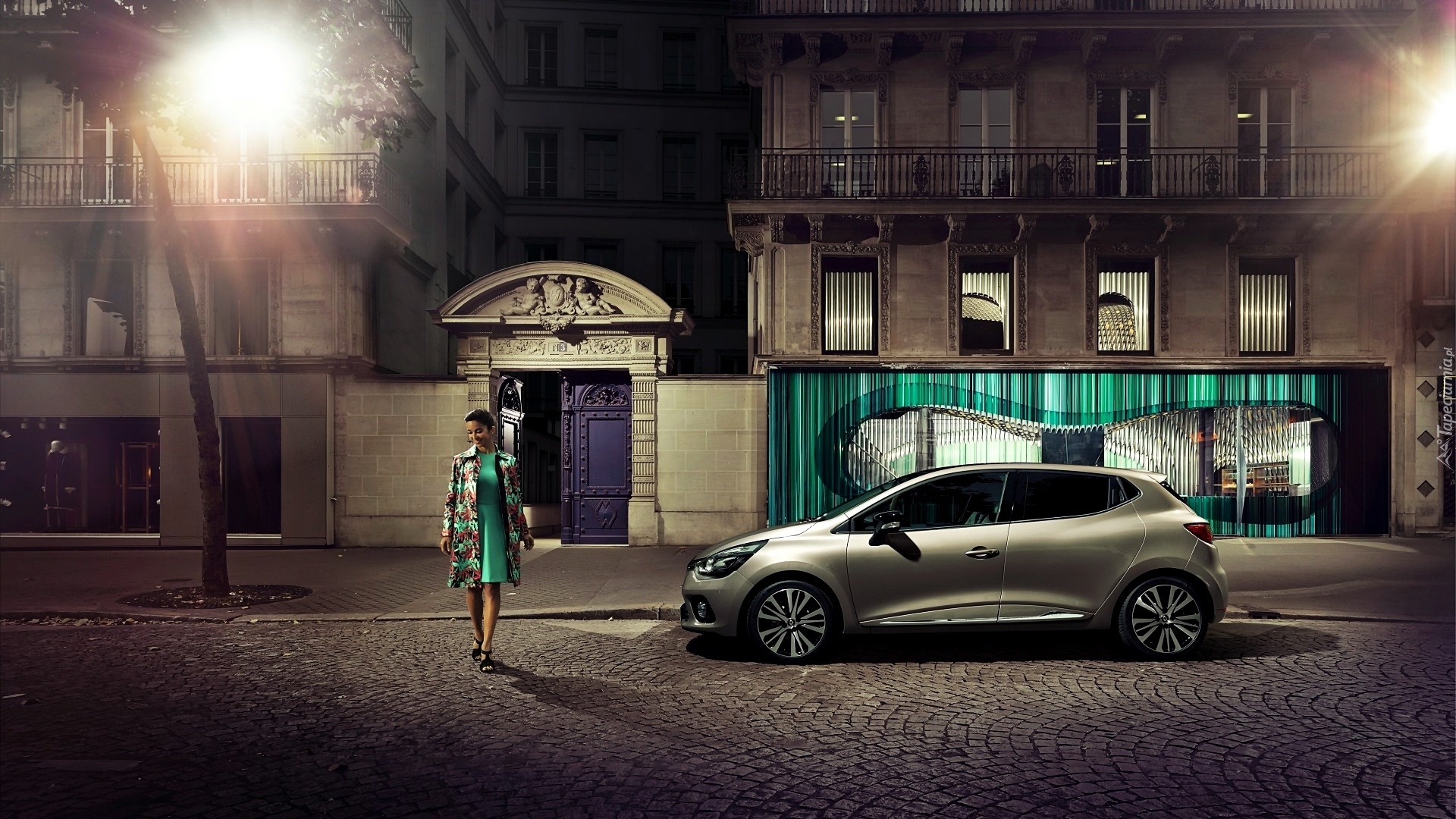 Edytor tapety: Renault, Clio, Ulica, Domy, Wieczór, Kobieta