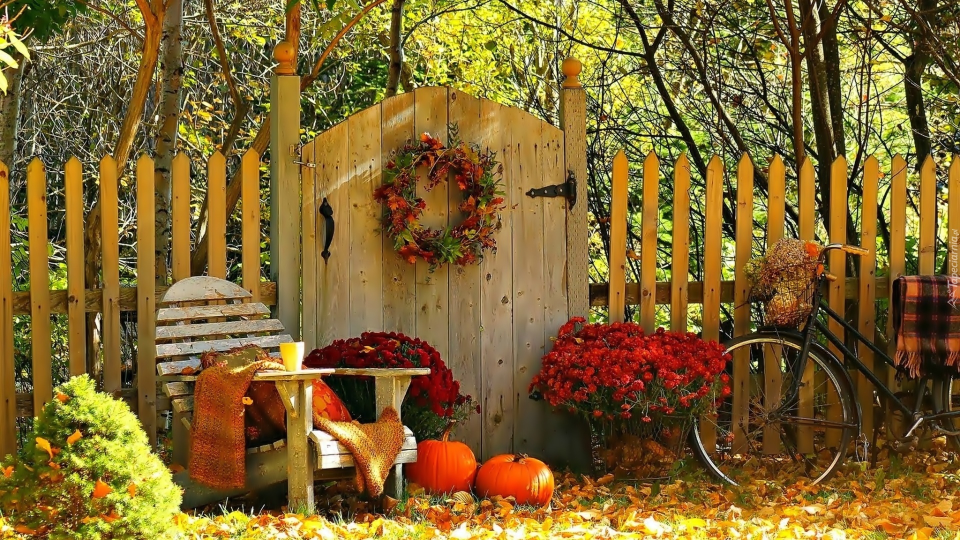 Edytor tapety: Ogród, Kwiaty, Dynie, Rower, Ogrodzenie, Jesień