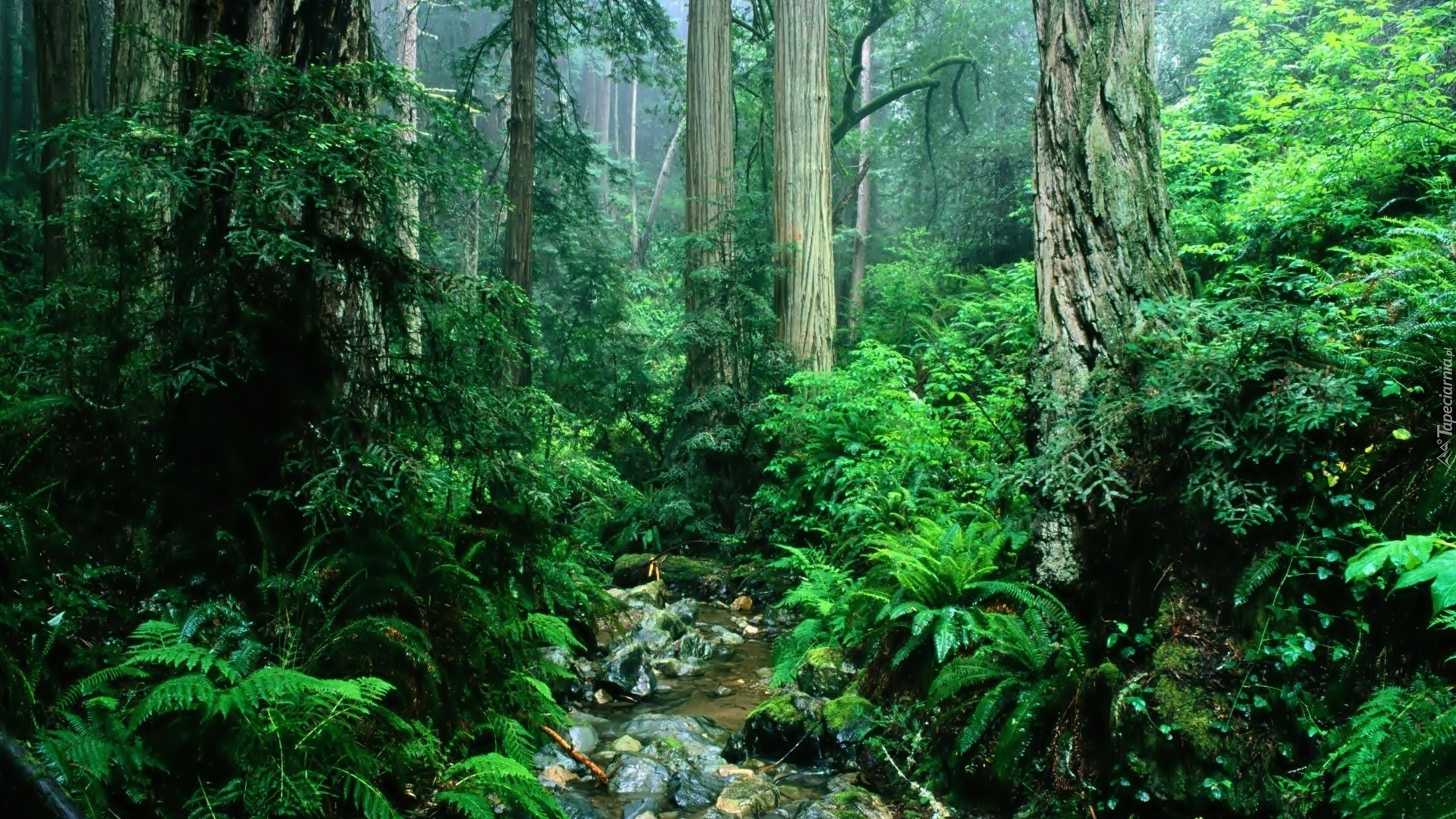 Edytor tapety: Las, Drzewa, Potok, Kamienie, Krzewy, Paprocie