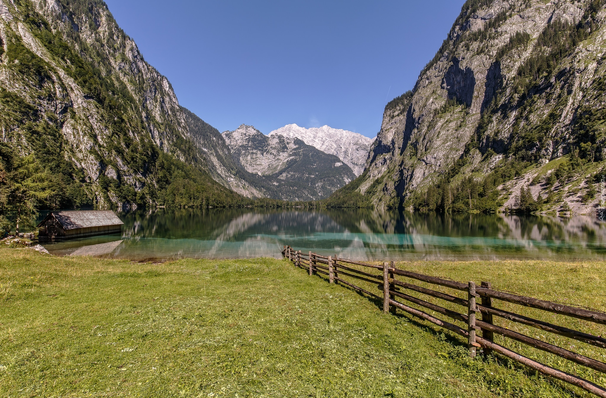 Edytor tapety: Niemcy, Bawaria, Park Narodowy Berchtesgaden, Jezioro Königssee, Alpy Bawarskie, Łąka, Płot