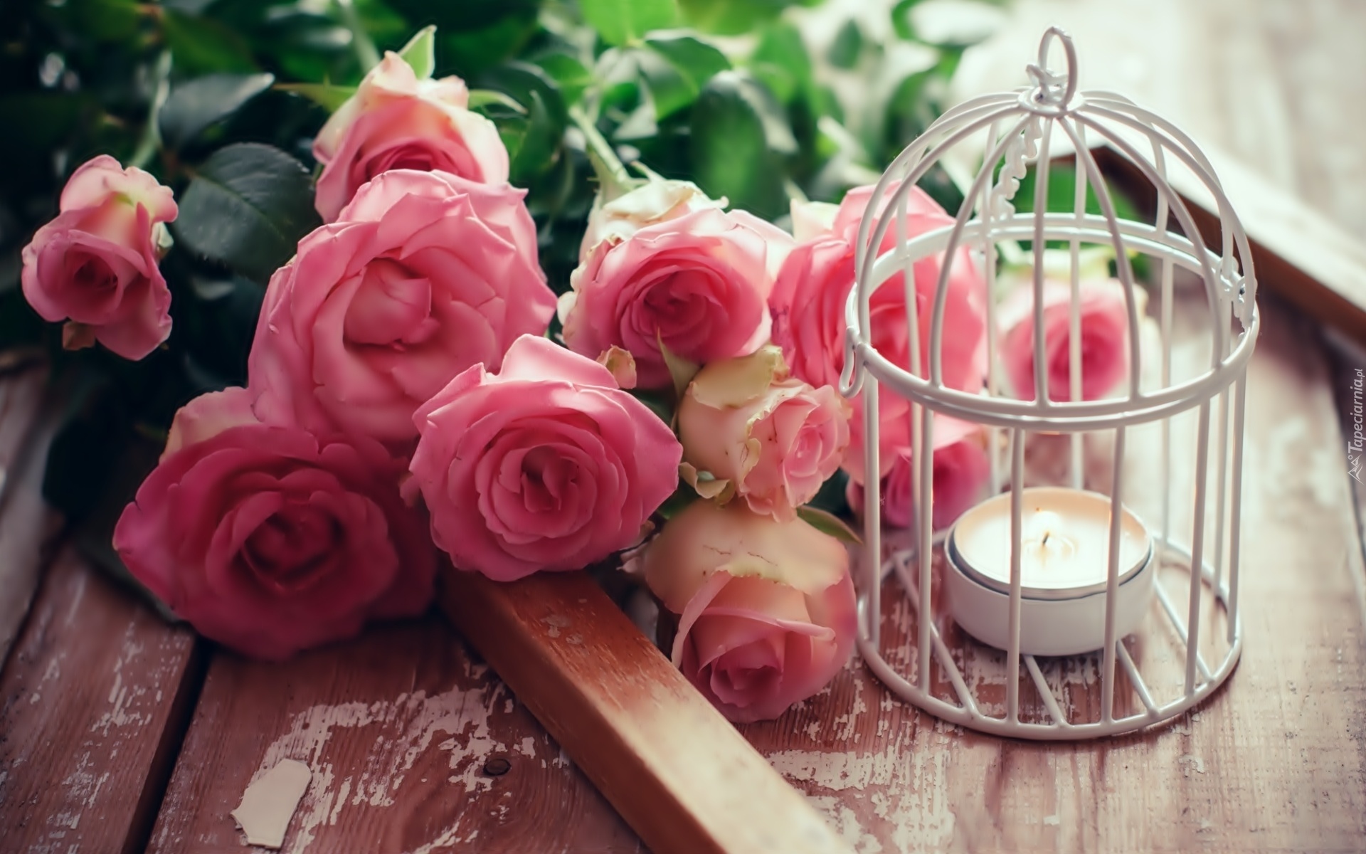 Edytor tapety: Kompozycja, Różowe, Róże, Bukiet, Świeca