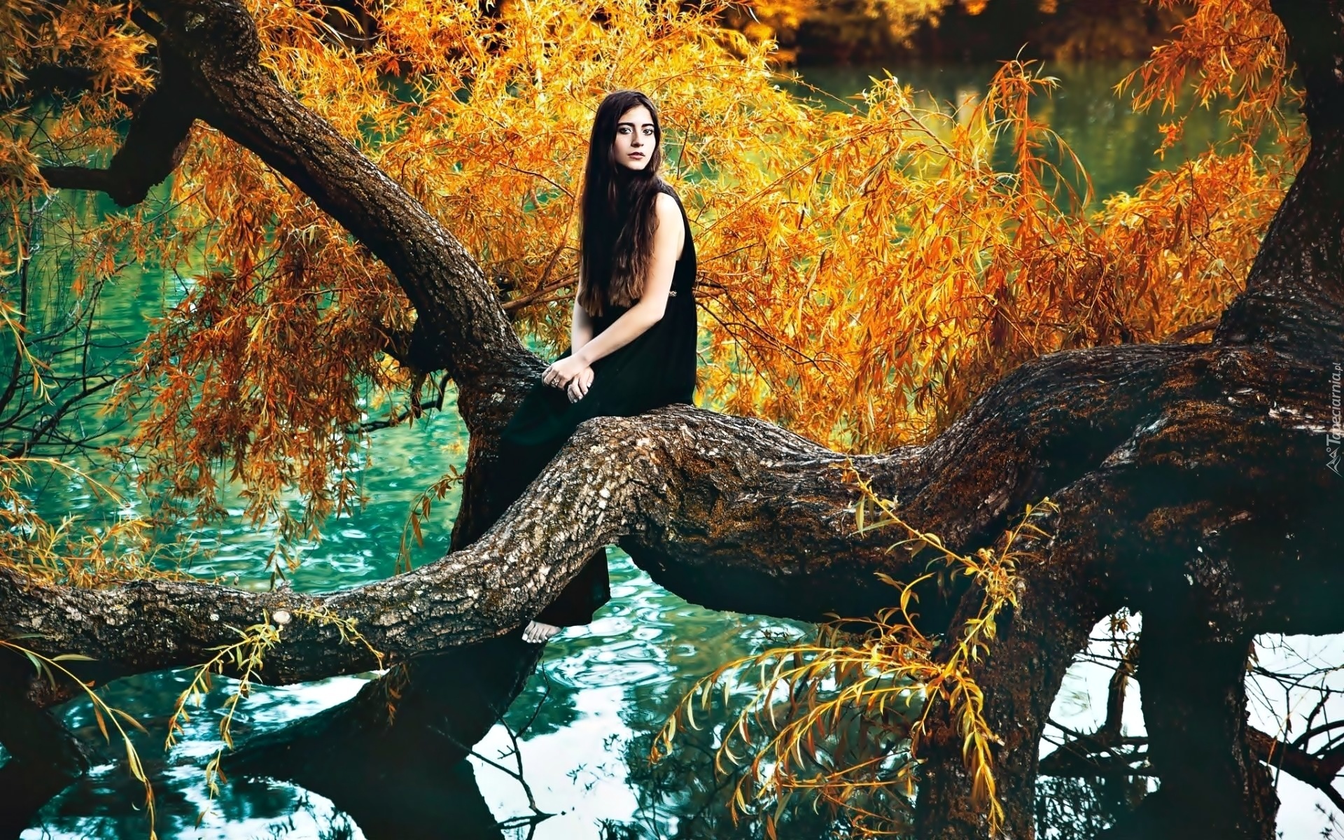 Edytor tapety: Kobieta, Staw, Drzewo, Jesień
